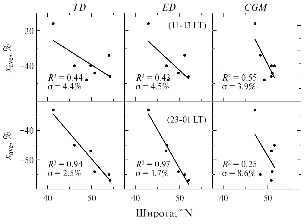 Не менее важным является очень большой диапазон изменений xave между анализируемыми станциями: |xave| = 15.5±7.5% и |xave| = 24±10% для дневных и ночных часов. Анализируемые станции подбирались так, чтобы разница в CGM-широтах этих станций была минимальной. В данном случае их CGM-широты лежат в диапазоне 49±2 °N. Эффекты ионосферных возмущений в периоды повышенной геомагнитной активности зависят от широты, поскольку источник этих возмущений расположен в высоких широтах. Возможно, что они значительны даже для такого небольшого диапазона CGM-широт. Возможно также, что ED или TD координаты являются более точными для описания возмущений в ионосфере средних широт в периоды повышенной геомагнитной активности. Для проверки этих предположений по данным xave в таблице 1 были определены коэффициенты уравнений регрессии (a и b) и статистические свойства этих уравнений