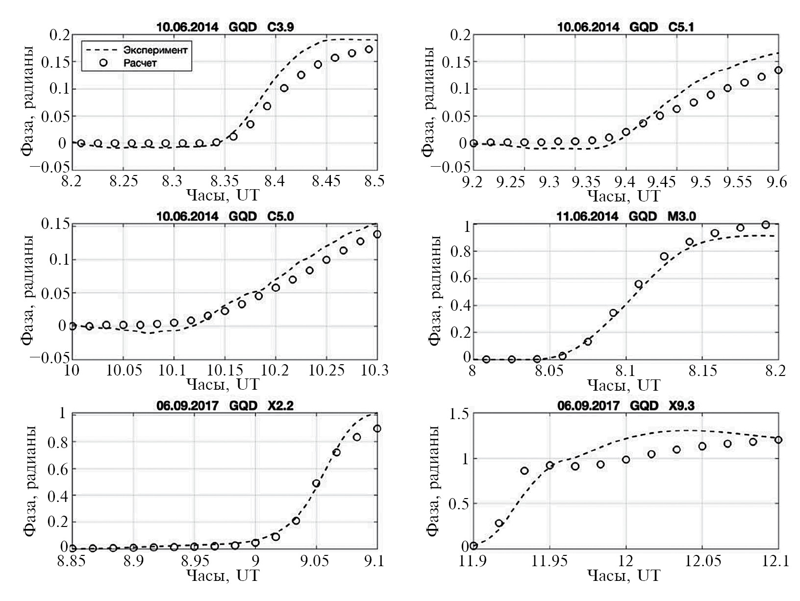 Сравнение экспериментальных значений амплитуды и фазы сигналов с результатами расчета для 6 вспышек представлено на рис. 4 и рис. 5. Экспериментальные данные вариации амплитуды и фазы сигналов от станции GQD представлены штриховыми линиями, а результаты расчета амплитуды показаны кружками.