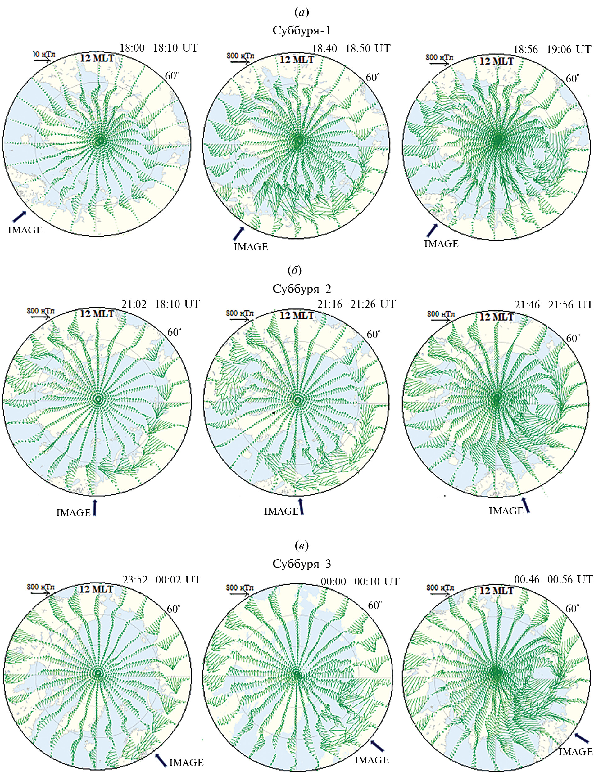 Суббуря-2 начала развиваться сразу после резкого окончания небольшого магнитного возмущения, разделяющего суббури-1 и -2, на фоне несколько увеличившейся во время главной фазы бури геомагнитной активности. Перед началом суббури (левая карта 21:02−21:12 UT на рис. 2б) ионосферные электроджеты были более интенсивны, чем перед суббурей-1, и сдвинуты к более низким широтам. Начало суббури-2 (центральная карта 21:16 – 21:26 UT на рис. 2б) сопровождалось развитием токового вихря в раннем утреннем секторе, а не в околополуночном секторе, где в это время наблюдалась сложная суперпозиция двух вихрей с противоположным направлением вращения, но на более низких широтах, чем в случае суббури-1. К моменту максимума активности суббури (правая карта 21:46 – 21:56 UT на рис. 2б) электроджеты еще более усилились, западный сдвинулся к полюсу, а восточный – к более низким широтам. Как и в суббуре-1, в утреннем секторе (05−08 MLT) наблюдалось формирование интенсивного токового вихря с направлением вращения по часовой стрелке, а в вечернем секторе – значительно более слабого вихря противоположного направления вращения, центр которого располагался на более низких широтах, чем в первой суббуре.