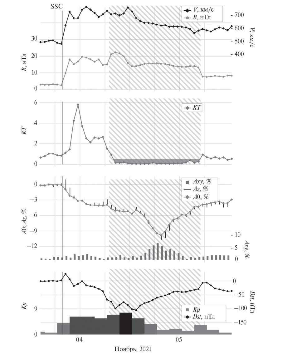 На рис. 1 представлен пример из базы данных FEID, демонстрирующий НТП (залитая серым цветом область на второй панели), связанный с ФП, вызванным ICME c MO у орбиты Земли. Первая (верхняя) панель показывает индукцию ММП (левая шкала) и скорость СВ (правая шкала), на второй панели показано поведение температурного индекса, третья сверху панель показывает вариации плотности КЛ (кривая A0, левая шкала), изменение северо-южной компоненты анизотропии КЛ (вертикальные линии на кривой, Az, левая шкала) и экваториальной составляющей анизотропии КЛ (столбики Axy, правая шкала), а на четвертой (нижней) панели изображено поведение геомагнитных Kp- и Dst-индексов. Вертикальной линией обозначается начало ФП, заштрихованный прямоугольник обозначает время прохождения МО. Данное событие связано с межпланетным возмущением, вызванным солнечной вспышкой (M1.7 с координатами N14E01 в 01:20 UT 2 ноября 2021 г., АО 12891) и последовавшим корональным выбросом массы (в 02:48 UT с начальной скоростью 1473 км/с). 3 ноября 2021 г. в 19:42 UT было зарегистрировано SSC (Sudden Storm Commencement). В околоземном космическом пространстве экстремальные значения параметров солнечного ветра составили: Vmax = 762 км/с, Bmax = 22.3 нТл, длительность НТП DUR = 21 ч, а мощность SUM = 2.05. Также в указанном возмущении наблюдалась структура МО продолжительностью 32 ч (с 07 UT 4 ноября по данным каталога (http://www.srl.caltech.edu/ACE/ASC/DATA/level3/icmetable2.htm). Величина ФП в событии составила AF = 9.8%, максимальная экваториальная составляющая анизотропии КЛ достигла значения Axymax = 6.77%, а разброс значений северо-южной составляющей анизотропии составил Azrange = 3.23%. Была зарегистрирована очень большая магнитная буря (Kpmax = 8–, Dstmin = –105 нТл).