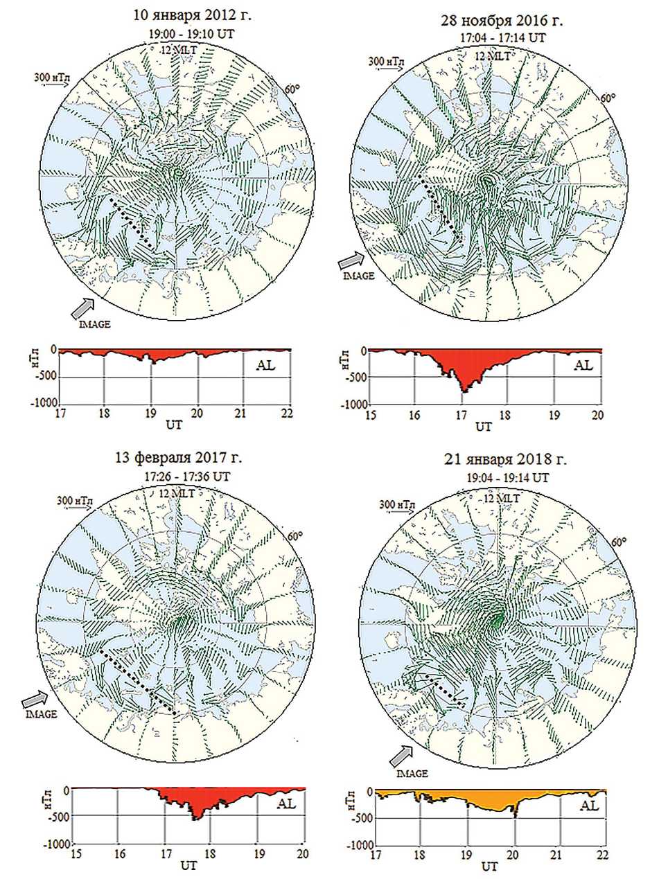 На рис. 2 приведены четыре примера карт ионосферных токов AMPERE во время начала типичных случаев “полярных” суббурь, зарегистрированных на профиле IMAGE, положение которого показано стрелкой в нижнем левом углу карт. Под каждой картой также показаны графики AL-индекса в рассматриваемое на карте время. На всех картах видно, что к востоку от меридиана IMAGE в раннем утреннем секторе Земли наблюдается развитие западного электроджета на геомагнитных широтах порядка 70° MLAT, т.е. выше типичных широт “классических” суббурь.