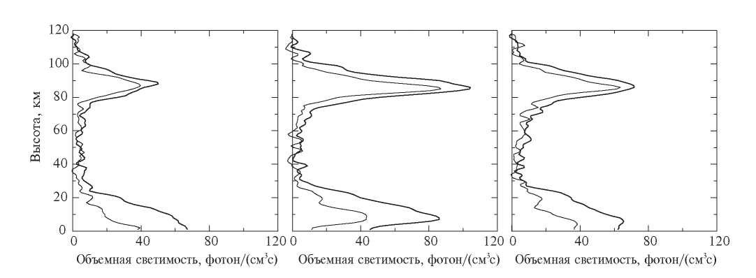 На рис. 6 изображены вертикальные профили объемной светимости атмосферы, рассчитанные в соответствии с решением (3), исходя из профилей яркости, представленных на рис. 5.