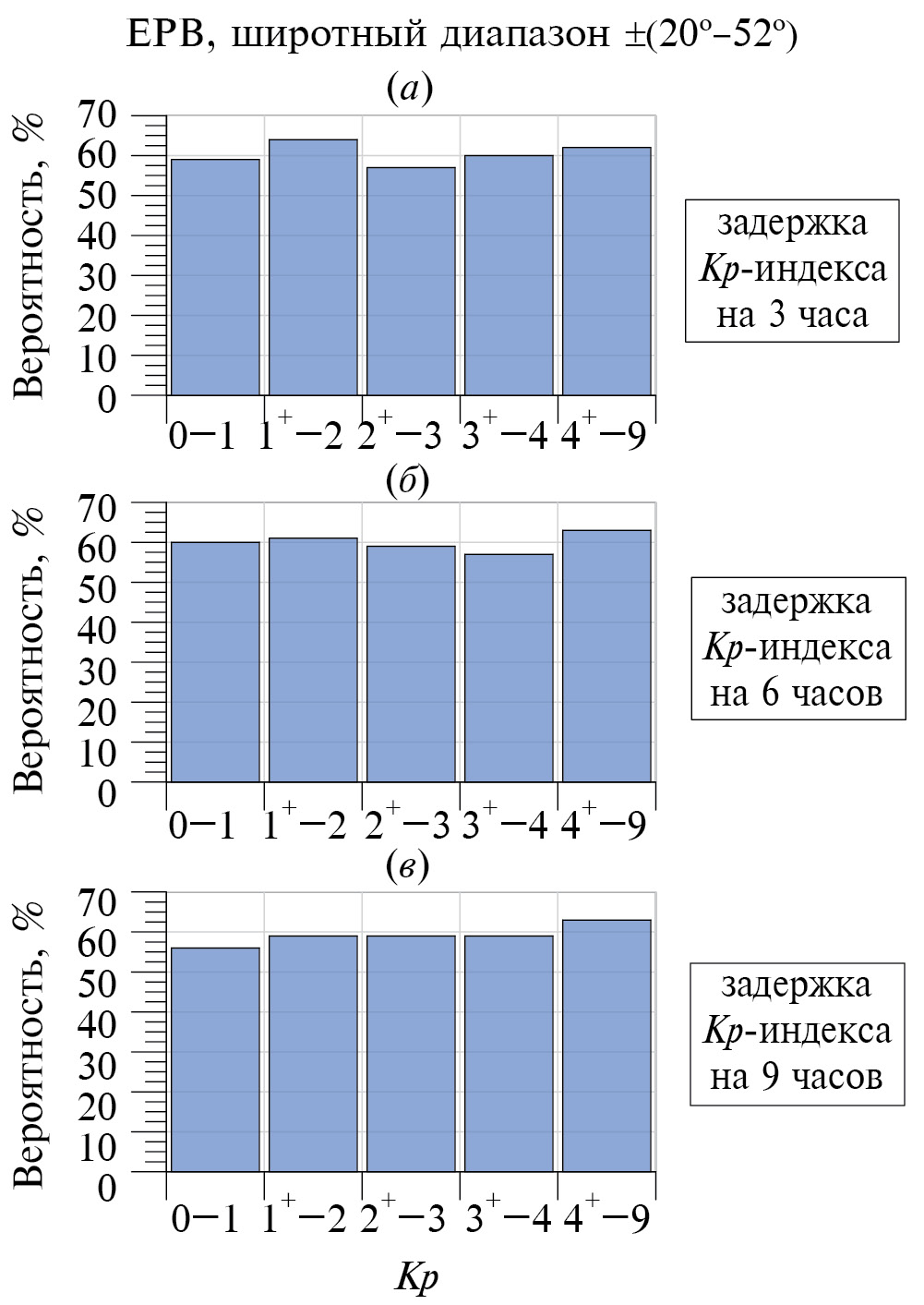 Кр-вариации РЕРВ, полученные в области средних широт ± (20°–52°) (рис. 3), при задержках Kp-индекса на 3−6 часов четкой зависимости РЕРВ от Kp не имеют. Однако при задержке Kp-индекса на 9 часов значения РЕРВ находятся в прямой зависимости от Kp-индекса: они немного возрастают при росте значений Kp.
