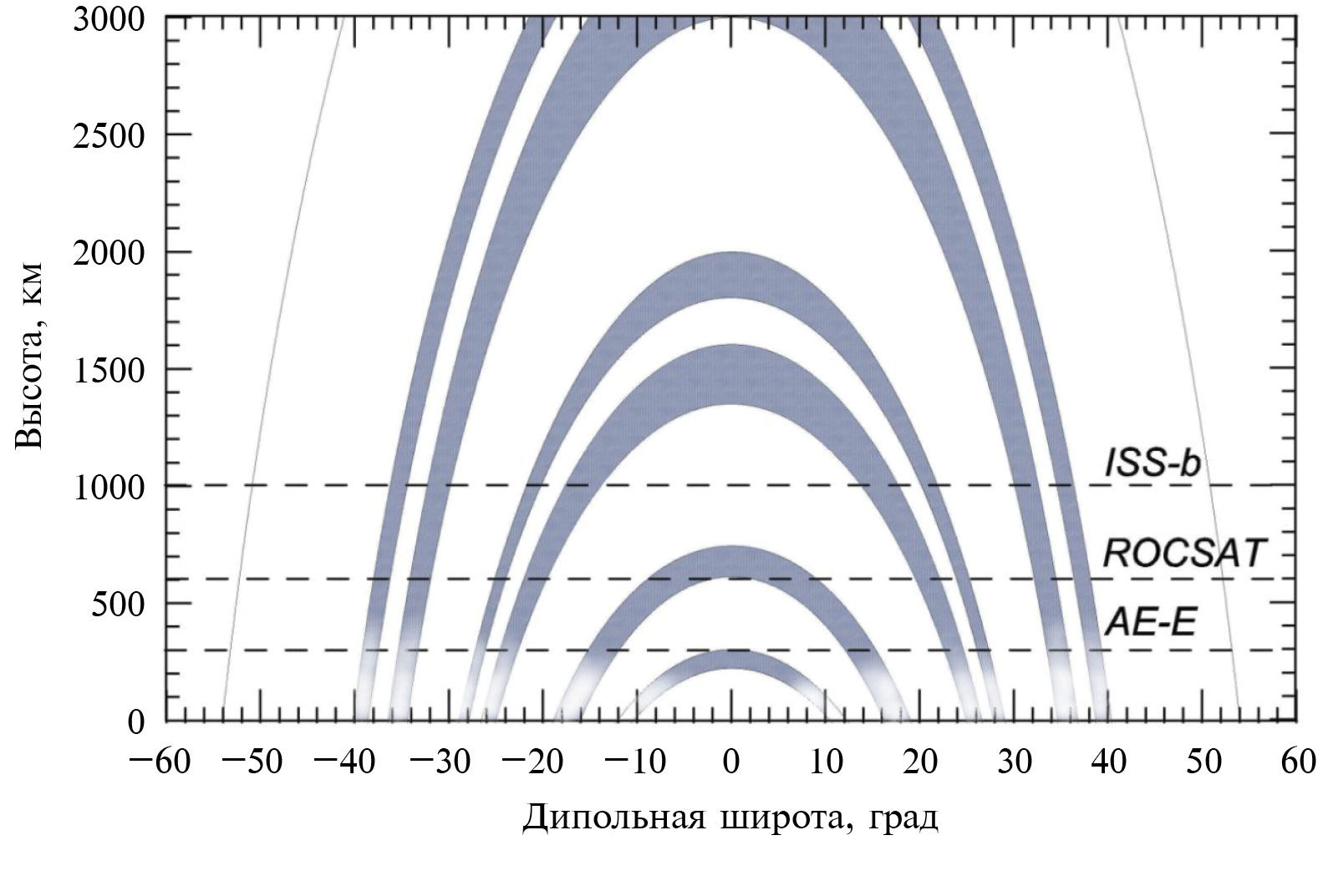 В ночные часы на высотах верхней ионосферы в фоновой концентрации He+ развивается экваториальный провал, во впадине и на гребнях которого могут регистрироваться ЕРВ. Непосредственно сама впадина экваториального провала приходится на широты ~ (± 20°), а гребни провала могут достигать ± 30°–40° (см., например, [Taylor, 1971]). Наиболее хорошо ЕРВ видны на гребнях провала: вершине гребня, внутреннем и внешнем его склонах. Пузыри видны очень хорошо, поскольку наиболее хорошо контрастируют с повышенной здесь фоновой концентрацией He+. Несколько труднее ЕРВ могут регистрироваться во впадине провала, поскольку фоновая концентрация He+ во впадине значительно ниже и хуже контрастирует с концентрацией He+ внутри пузыря. Этим и объясняется значительная разница в вероятности наблюдения ЕРВ на разных широтах. В области впадины экваториального провала фоновой концентрации He+, т.е. на широтах ~ (± 20°), вероятность наблюдать ЕРВ понижена, а на широтах гребней со склонами, т.е. на средних широтах ± (20°–52°), ЕРВ обнаруживаются намного чаще.