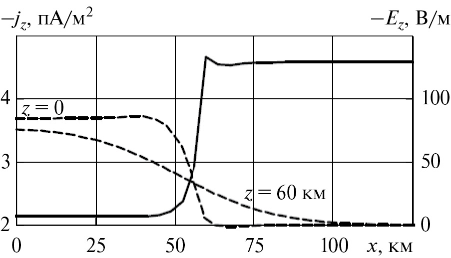 На рис. 3 показаны полученные вертикальные компоненты плотности тока на двух высотах (штриховые линии) и напряженности электрического поля над землей (сплошная кривая). Видно примерно удвоение плотности тока над землей в области эманации радона, а напряженность электрического поля там уменьшилась приблизительно в 17 раз. С подъемом к ионосфере границы пятна дополнительного тока (отличие от тока хорошей погоды, имеющего плотность j0 = 2 пА/м2 в нашей модели) расплылись, однако характерный радиус, при котором плотность тока убывает вдвое, остался близким к 60 км. Полный дополнительный ток δI равен 15 мА. Отметим, что при меньших размерах области эманации радона радиус пятна дополнительного тока увеличивается с подъемом к ионосфере примерно до 50 км [Denisenko et al., 2023], и поэтому плотность тока значительно уменьшается.