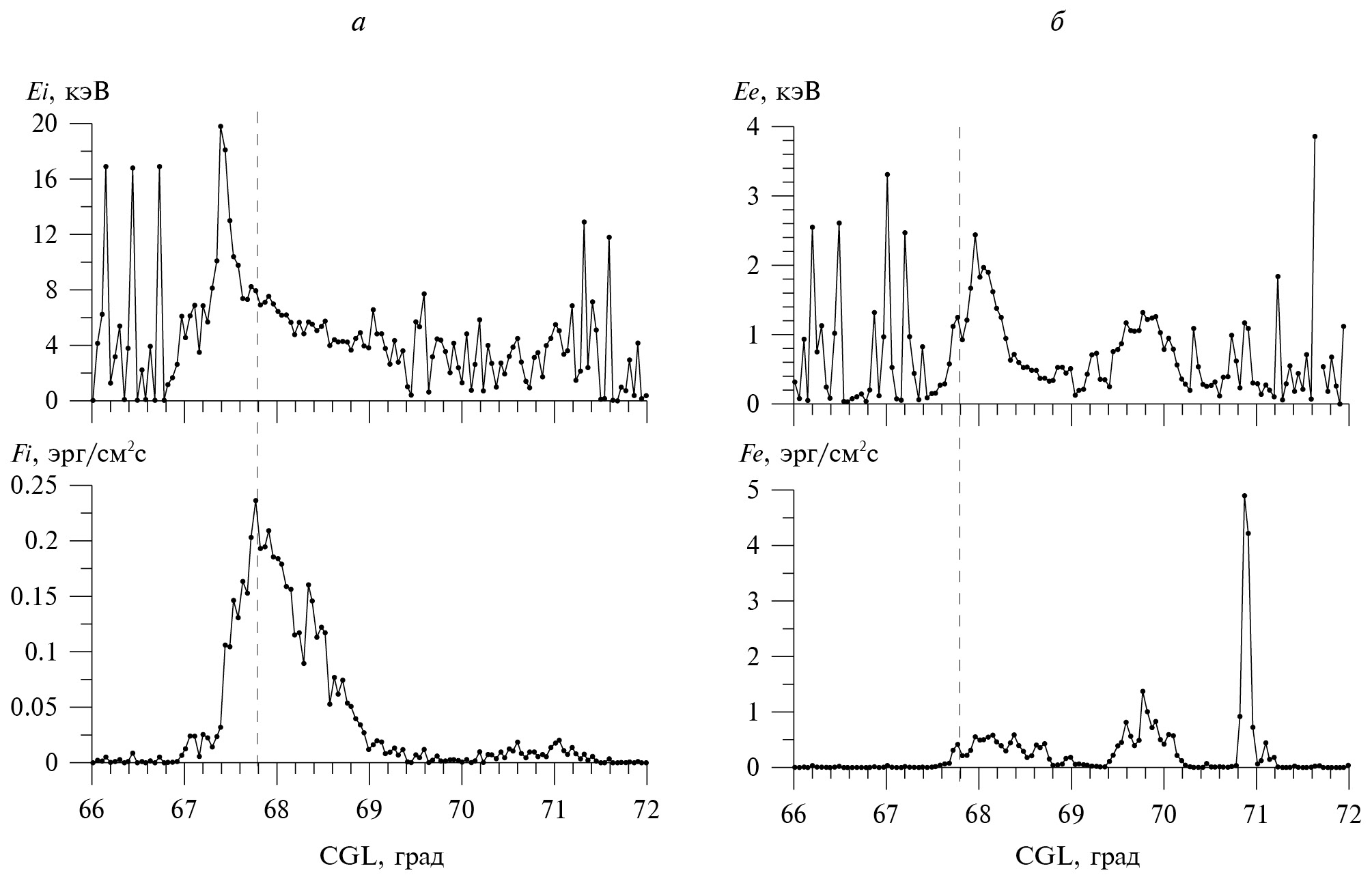 Широтные распределения характеристик ионных (а) и электронных (б) высыпаний по наблюдениям спутника F7 в этом пролете представлены на рис. 2. Сверху вниз на рис. 2а показаны средние энергии (Ei, кэВ) и потоки энергий (Fi, эрг/см2 с) ионных высыпаний, а на рис. 2б – средние энергии (Eе, кэВ) и потоки энергий (Fе, эрг/см2 с) электронных высыпаний. Точки на графиках соответствуют значениям параметров, измеренных спутником. По горизонтальной оси на рисунке отложена исправленная геомагнитная широта (CGL). В этом пролете спутника положение максимума Fi, соответствующее положению границы b2i, было зарегистрировано на широте 67.8° CGL в 03:09 UT (время округлено до минут). На рис. 2 положение b2i отмечено вертикальной штриховой линией.