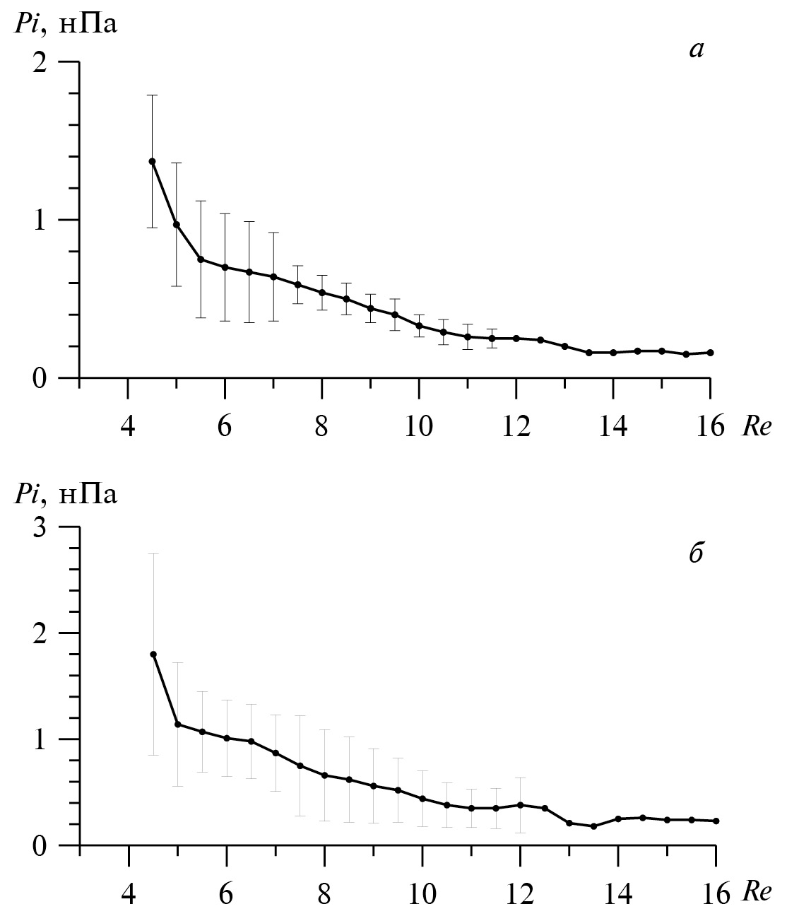 На рис. 6б показан профиль ионного давления при спокойных условиях, но при отрицательных значениях Bz-компоненты ММП (AL>−200 нТл, Dst>−20 нТл, Psw = 3.5 ± 1.0 нПа, Bz ММП= =−1.0 ± 1.0 нТл). Такие параметры наиболее близки к фазе зарождения суббури и к условиям, соответствующим распределению ионного давления на рис. 4б.