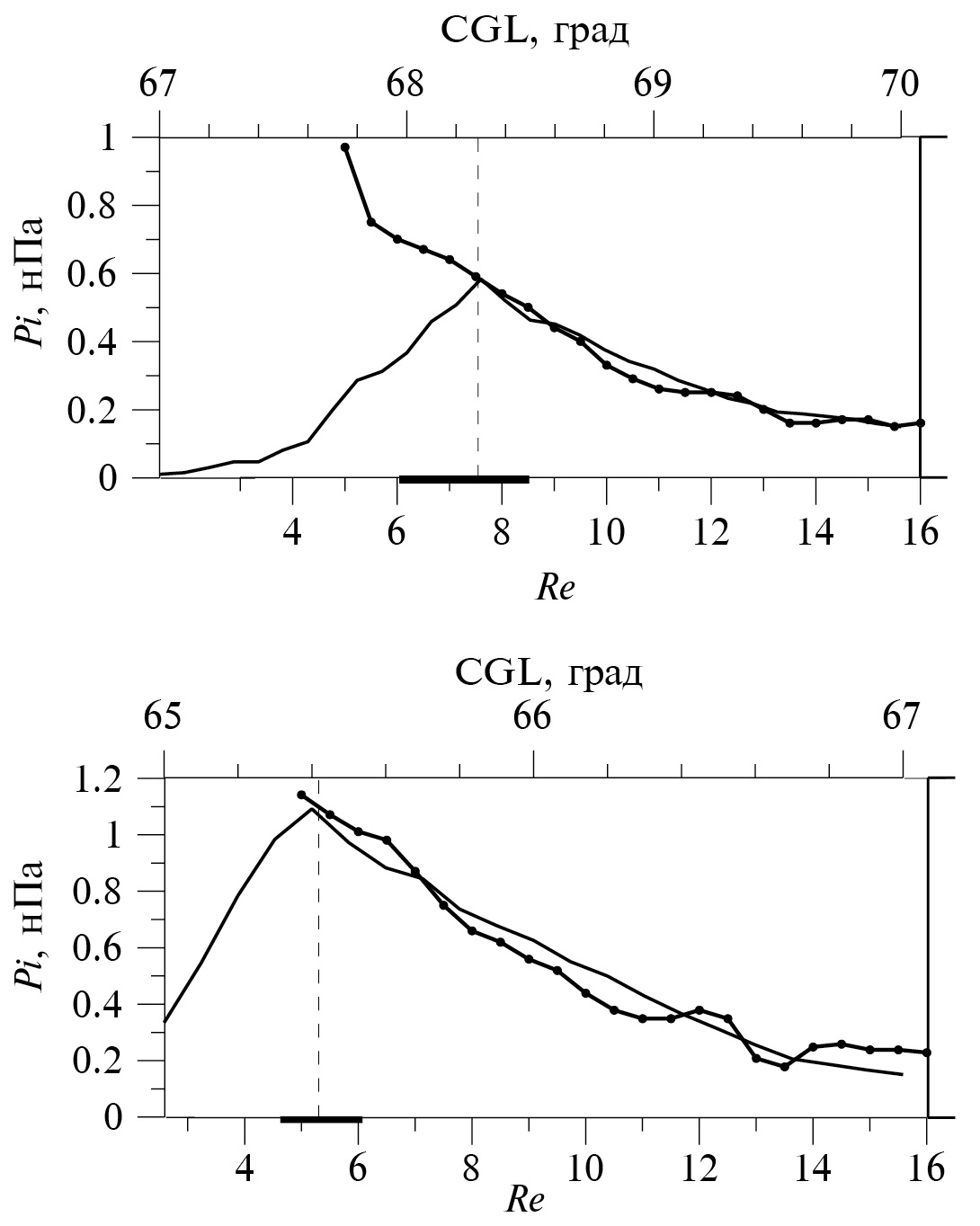 Результаты такого морфологического проецирования (тонкая сплошная кривая) и сопоставления с радиальным профилем давления по данным THEMIS (кривая с точками) представлены на рис. 7. Верхняя горизонтальная шкала на рис. 7 показывает исправленные геомагнитные широты, а нижняя – радиальное расстояние, на которое эти широты проектируются в экваториальную плоскость магнитосферы. Так как разброс данных в экваториальной плоскости на больших Re очень значительный, верхняя и нижняя шкалы в данном представлении не интерпретируются как соответствующие друг другу по всей длине. Важным в этом подходе является (1) схожесть поведения ионного давления с увеличением широты в ионосфере и расстояния в экваториальной плоскости при определении только в двух крайних точках: положение максимума на ионосферных высотах и положение минимального давления на расстояниях ~13−14 Re и (2) определение положения проекции границы b2i в экваториальной плоскости.