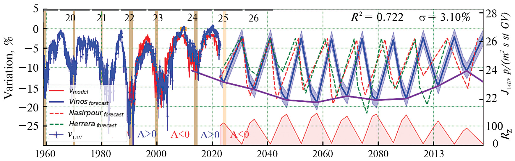 Можно выделить 3 прогноза [Herrera et al., 2021; Nasirpour et al., 2021; Vinos, 2022], выполненных в последние несколько лет. У них близкий временной ход, кроме того, в работах [Nasirpour et al., 2021; Vinos, 2022] достаточно точно прогнозируется максимум 25 цикла солнечной активности. В дальнейшем будем использовать только эти прогнозы (отдельно они показаны на нижней панели рис. 1). Из рисунка видно, что принятые нами прогнозы в начальный момент согласуются по фазе, но потом к концу столетия прогноз [Vinos, 2022] постепенно уходит по фазе примерно на 4 года. Этот уход связан с трудно прогнозируемой длительностью солнечного цикла.