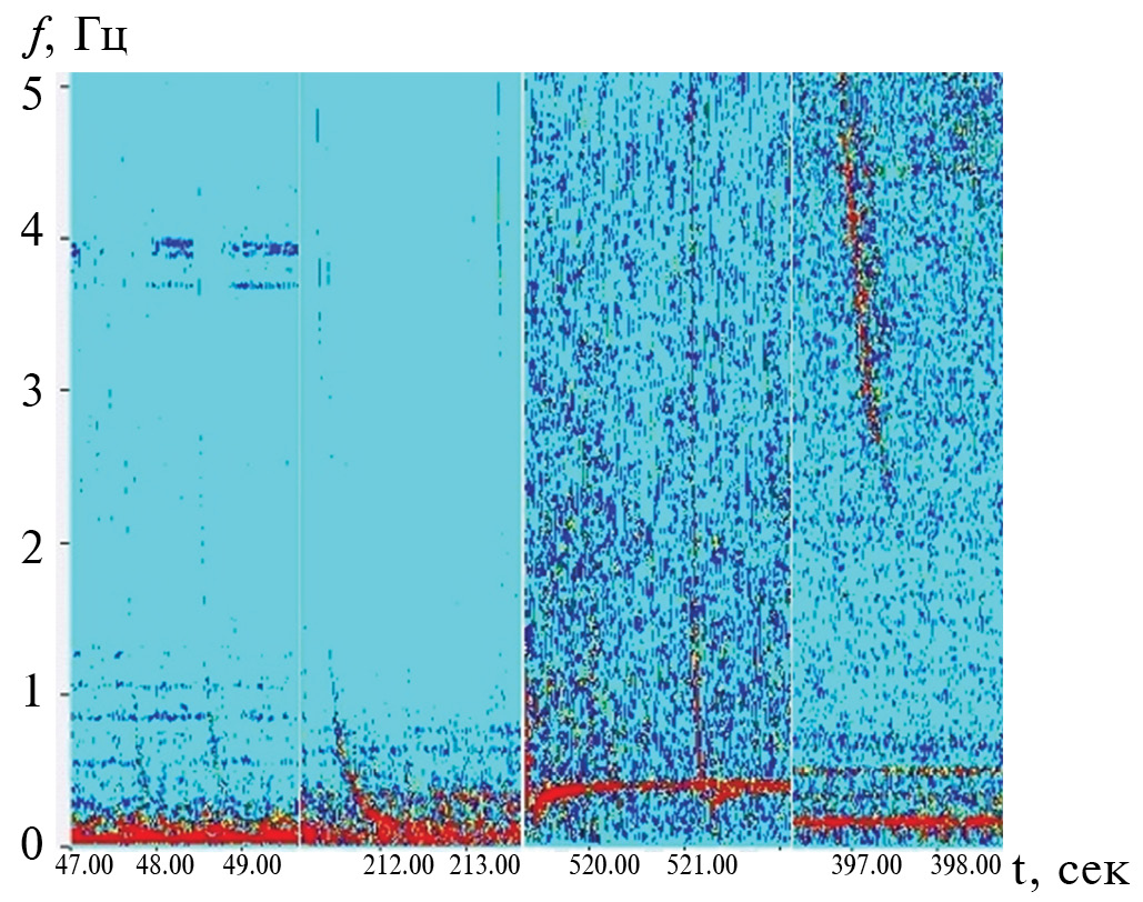- Ч. д. КНЧ СА (fmax < 1 kHz), так называемые “хвосты” наблюдались в дневное и утреннее время на спутниках ИК-24 (5851 и 9413), Ореол-3 на всех витках, К-1809 почти на всех витках.