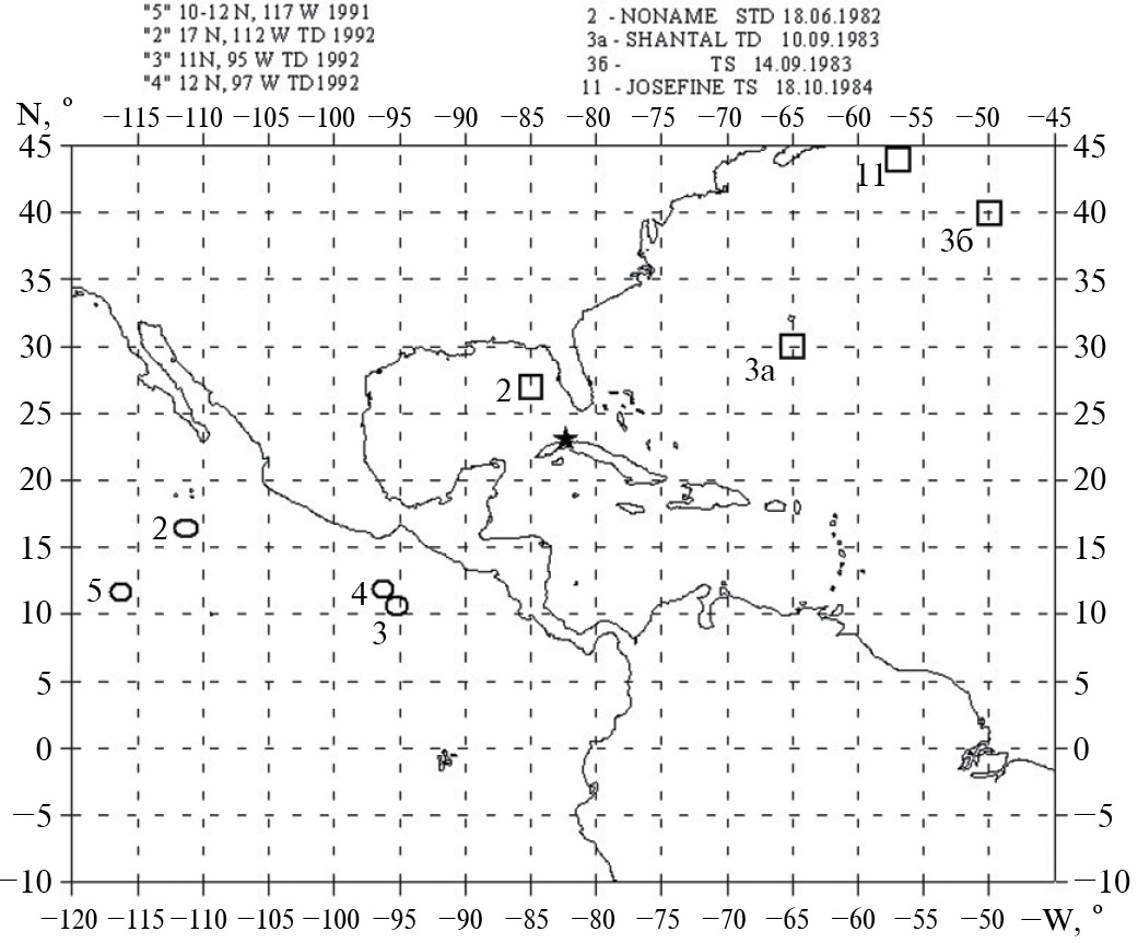 - Координаты и стадия циклона: “2” ‒ 27° N, 85° W STD no name 1982 г. “3а” ‒ 30° N, 65° W TD Shantal 1983 г. “3б” ‒ 40° N, 50° W TS Shantal. “11” ‒ 44° N, 57° W TS Josefine 1984 г.