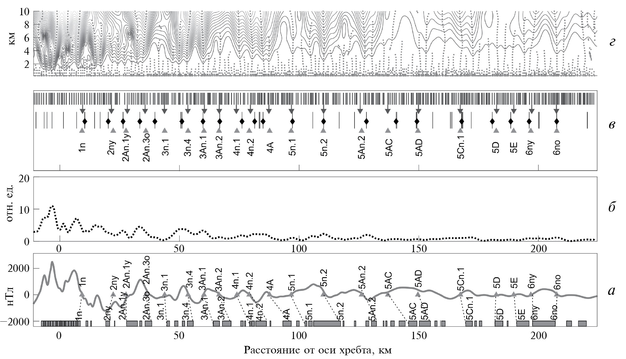 К данному профилю был применен вейвлет-анализ с порождающей функцией, являющейся 3-й производной от функции Гаусса. Одновременно для сравнения проводился анализ методом аналитического сигнала. На рис. 7б показан график модуля аналитического сигнала, рассчитанного от магнитных аномалий. Локальные максимумы аналитического сигнала, согласно его свойствам, расположены над или вблизи границ аномалеобразующих тел. Результат вейвлет-анализа приведен на рис. 7г. Сплошными линиями показаны изолинии модуля вейвлет-коэффициентов, точками ‒ локальные максимумы на каждом масштабе, масштабы пересчитаны в км. Сравнение полученных результатов вынесено в центральный блок (в). Здесь повторена модельная шкала, длинными вертикальными отрезками показаны положения экстремумов 3-й производной вейвлет-преобразования, перевернутыми треугольниками ▼ отмечены экстремумы, наиболее близко расположенные к искомым границам хронов, треугольниками ▲ отмечены сами границы, а короткими отрезками с ромбом ◆ ‒ показаны границы, определенные с помощью метода аналитического сигнала.