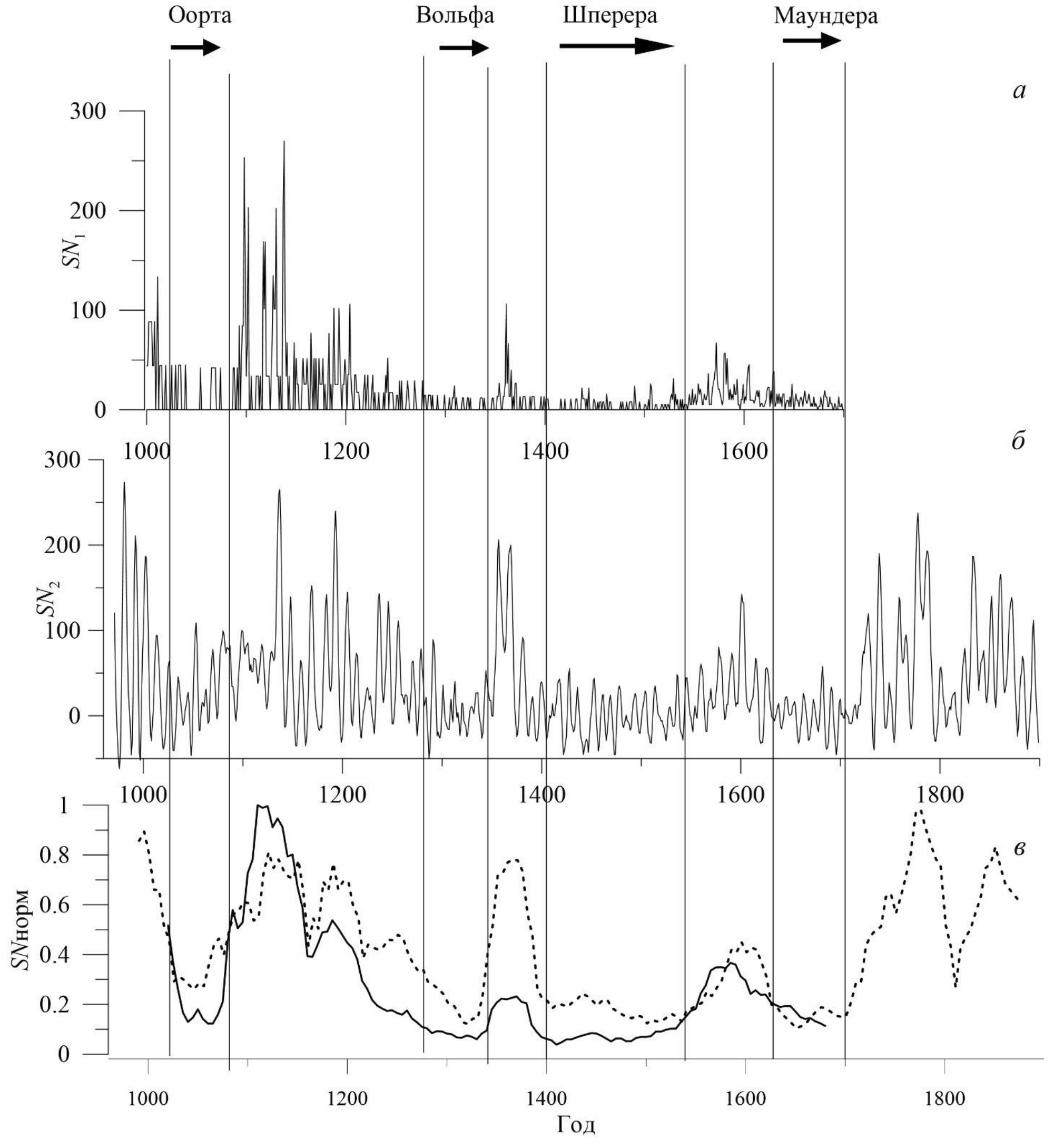 На рис. 1 заметна разница амплитуд SN1 и SN2. Меньшая амплитуда ряда SN1 (пропорциональная числу полярных сияний) возникает из-за того, что при его реконструкции использовались не все происходившие на Земле авроральные события, а только самые большие исторические полярные сияния, видимые на средних и в низких широтах. Несмотря на систематическую разницу амплитуд, ясно виден общий характер изменений СА во времени. В частности, для обоих рядов глобальные уменьшения и повышения амплитуды (гранд-минимумы и длительные максимумы) хорошо согласуются по времени. Чтобы подчеркнуть сходство этих рядов, мы сгладили их скользящим окном 40 лет и нормировали на максимальное значение. Результат показан на рис. 1в, сплошной линией – реконструкция по полярным сияниям, штриховой линией – по 14C. Размер выборки выбирался так, чтобы он не превышал временной интервал всех гранд-минимумов. Общий характер изменения рассматриваемых временных рядов не вызывает сомнения.