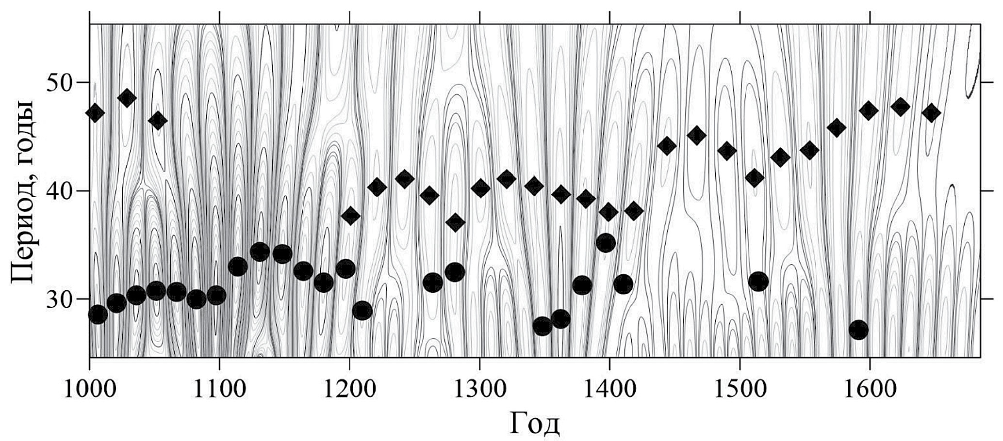 Рис. 3. Вейвлет-спектр временного ряда SN1. Изолинии ‒ модуль вейвлет-коэффициентов, круги ‒ максимумы 30-летней составляющей, ромбы ‒ максимумы 40-летней составляющей.