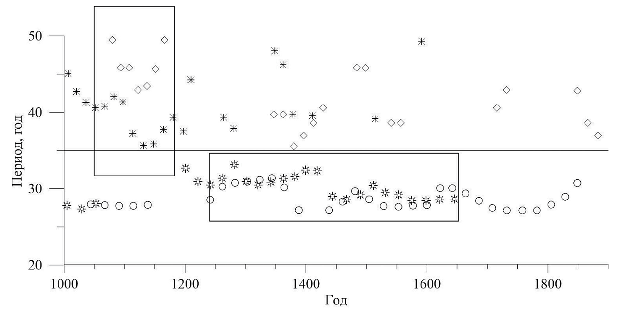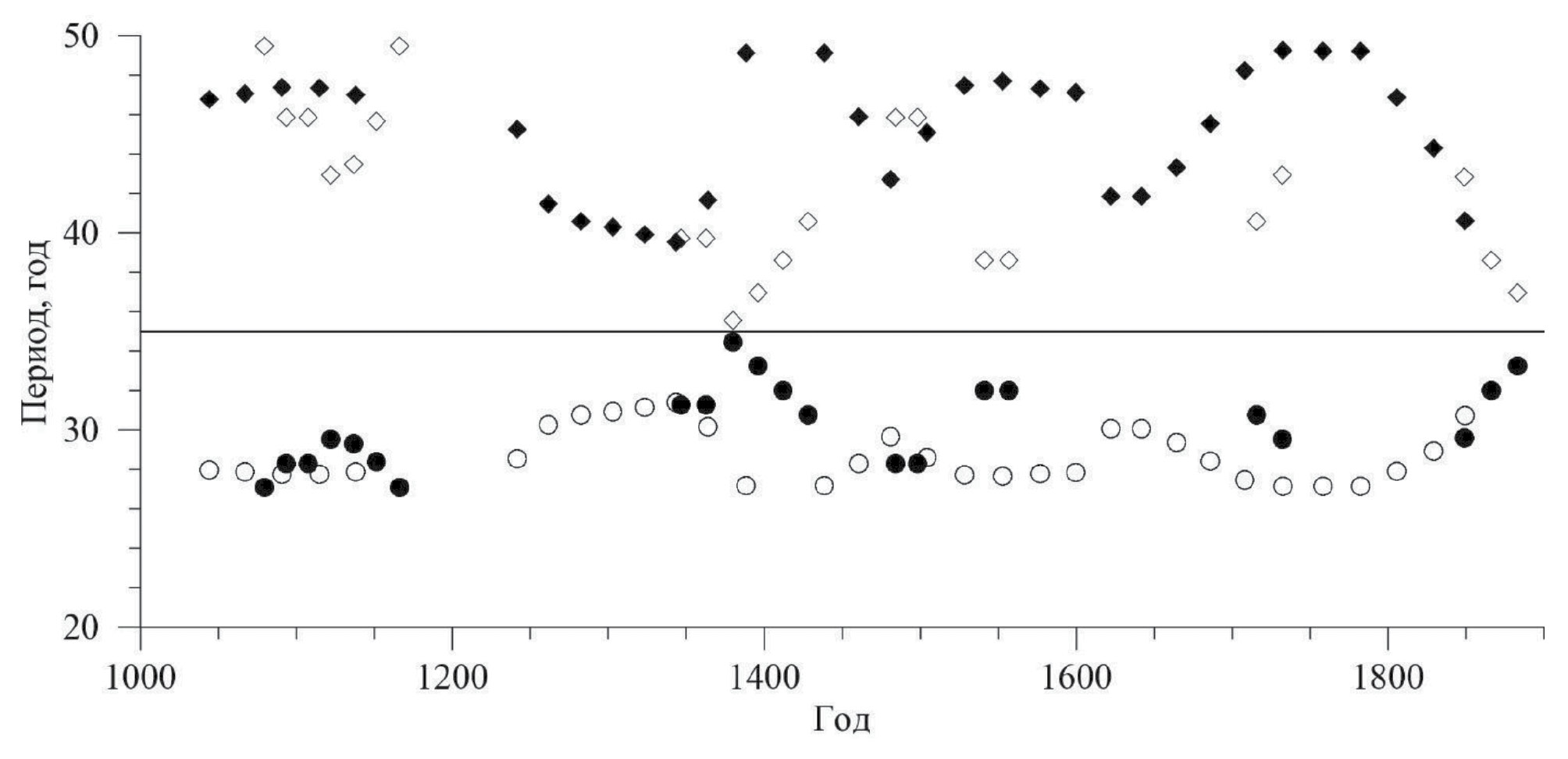 Рис. 4. Изменение периода 30−40-летних составляющих, найденных по вейвлет-спектру SN1 и прогнозируемых в рамках гипотезы о модуляции длинноволновым сигналом. Кругами обозначены периоды 30-летней составляющей, ромбами – 40-летней, закрашенные – полученные из вейвлет-спектра, незакрашенные – прогнозируемые.