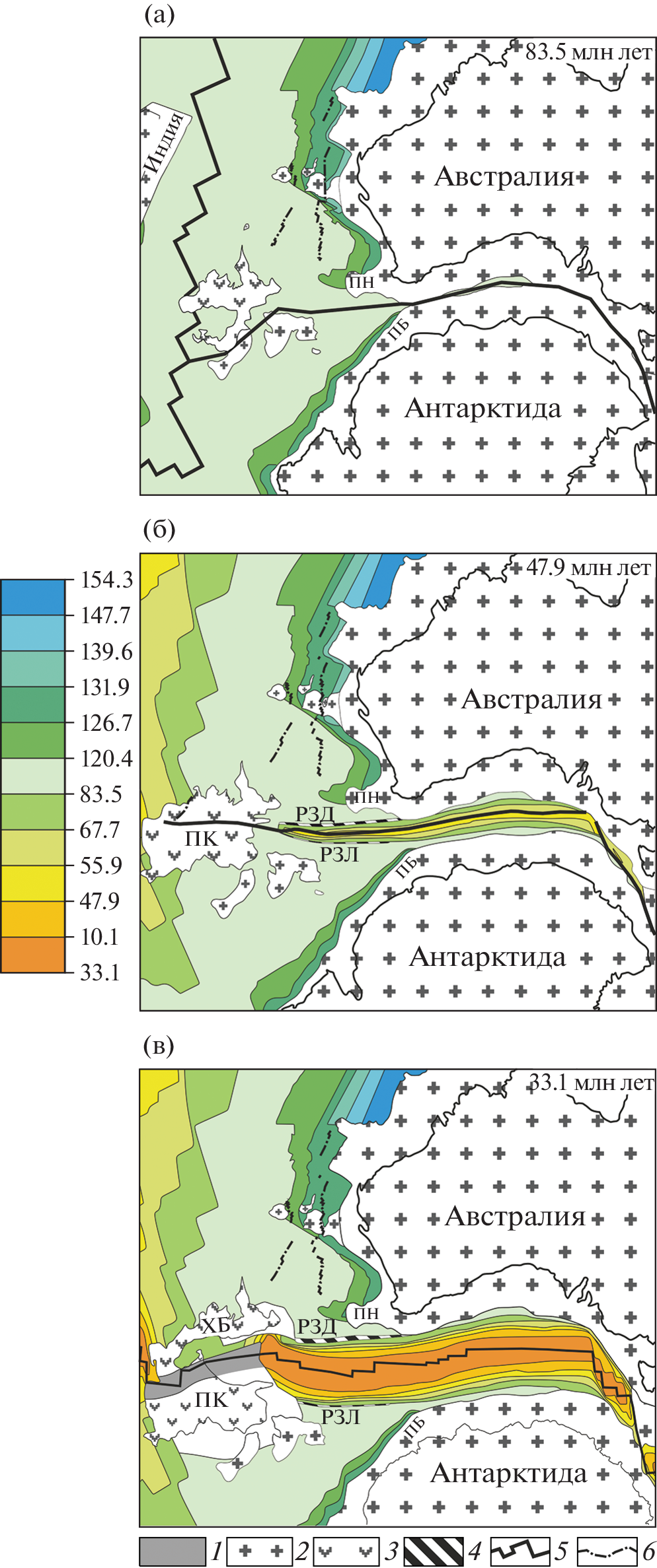 The authors of the article studied the features of the structure formation of the earth’s crust in the early period of the formation of the Southeast Indian Ridge, associated with the separation of Australia from Antarctica and the advancement of the rift zone to the west within the ancient oceanic lithosphere towards the large magmatic province of Kerguelen, formed by the activity of the plume of the same name. The separation of Australia and Antarctica covered a long period of continental rifting (~160‒80 Ma), which then turned into ultra-slow spreading (~80‒45 Ma), then into slow spreading (~45‒40 Ma) and then into stationary spreading at average rates (after 40 Ma). The advance of the rift zone towards the ancient oceanic lithosphere gave way to the accretion of young oceanic crust on the emerging Southeast Indian spreading ridge. The early stages of development of the young spreading ridge are captured in the modern structural plan of the study region. The advance of the rift zone from the continent into the boundaries of the ancient oceanic lithosphere led to the formation of the Naturalist Plateau and the Bruce Bank near the Antarctic margin. The split of the ancient oceanic lithosphere and the formation of a young crust on the Southeast Indian Ridge led to the formation of conjugated Diamantina and Labuan suture zones, fixing the position of the initial rift split. The transition from ultraslow spreading at the initial stage of oceanic crust formation to stationary spreading with medium velocities is clearly recorded in the change in the irregularity of the accretionary relief. The Southeast Indian Spreading Range westward collided with a large igneous province during the formation of the Kerguelen Plateau and separated the Broken Range from the plateau. The authors carried out physical modeling of the conditions for the occurrence of rifting and spreading processes, as well as structure formation in the region of the Southeast Indian Ridge.