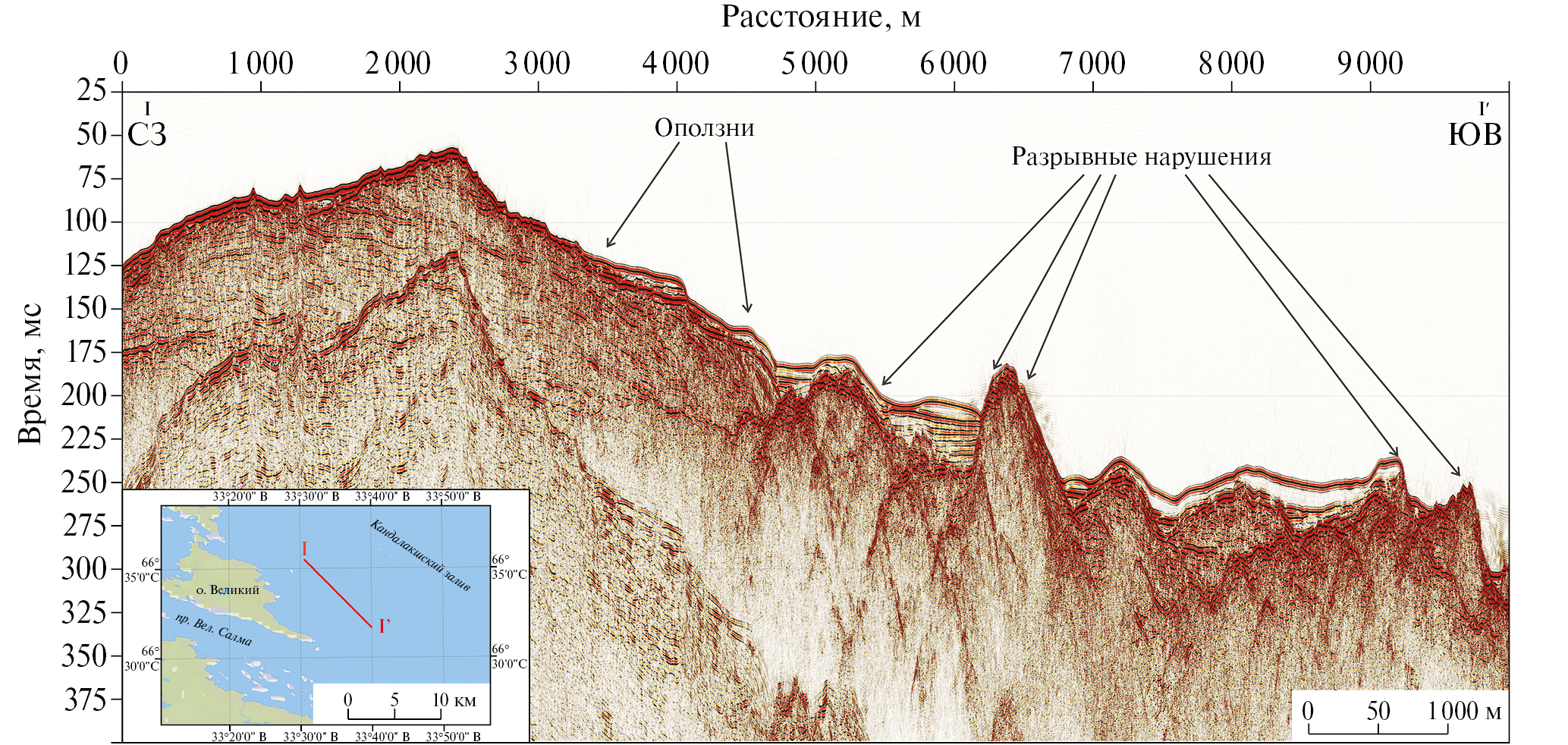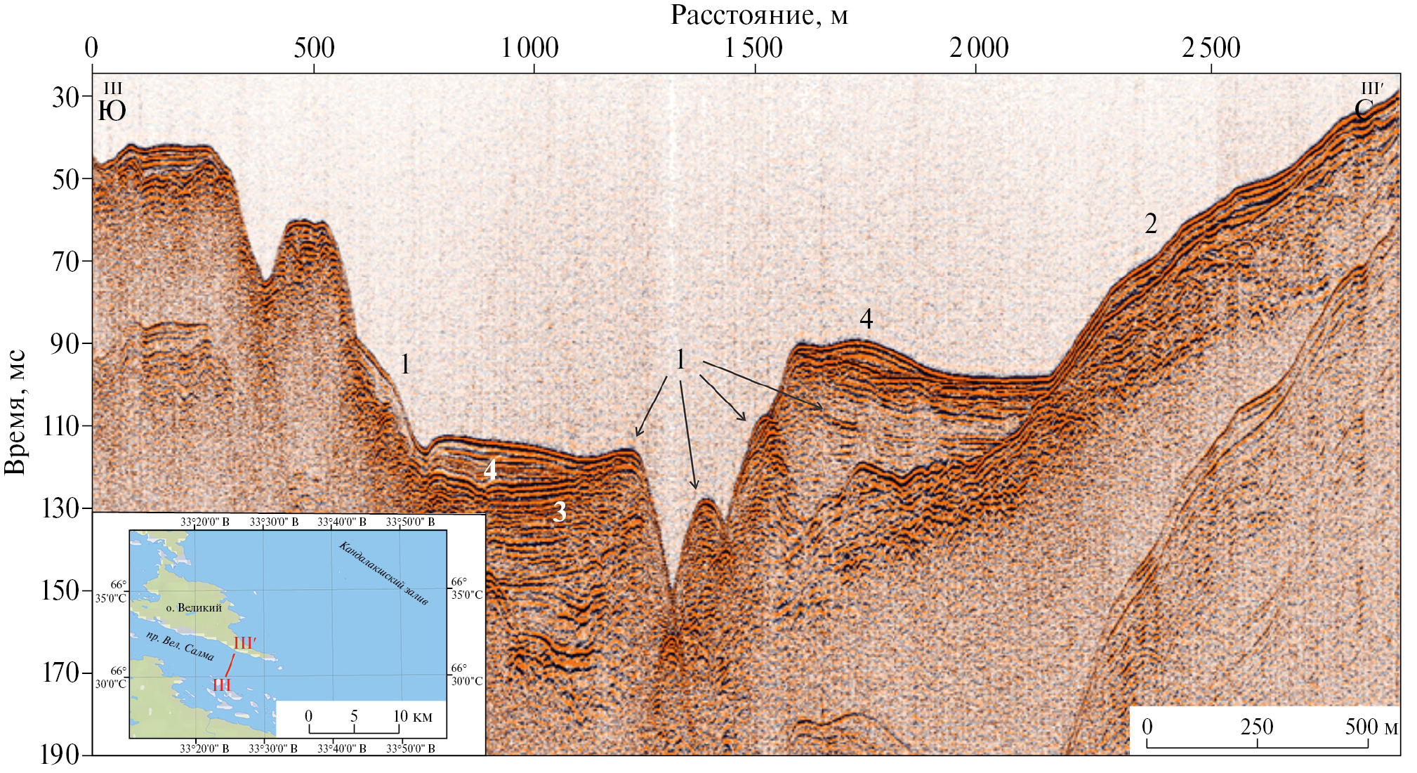 Рис. 3. Сейсмоакустический профиль I‒I′ по восточному склону поднятия островов Средние Луды в Кандалашском заливе.