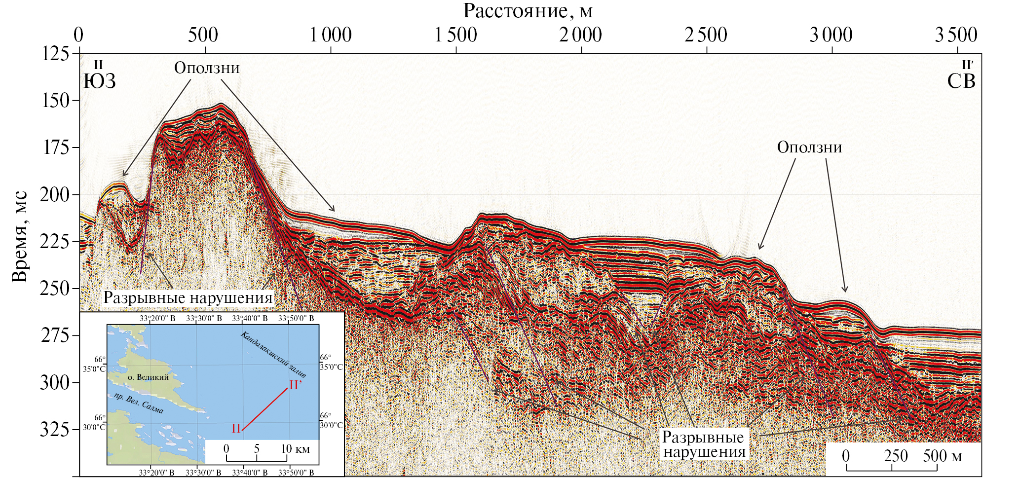 Эти блоковые дифференцированные движения происходят на фоне унаследованного общего поднятия западной части Беломорского бассейна при относительном погружении восточной, в настоящее время со скоростью +4 мм/год и -1– -2 мм/год соответственно [46]. На сейсмограммах отчетливо выделяются ступенчатые склоны со значительными градиентами между бровкой и подножием (рис. 4).
