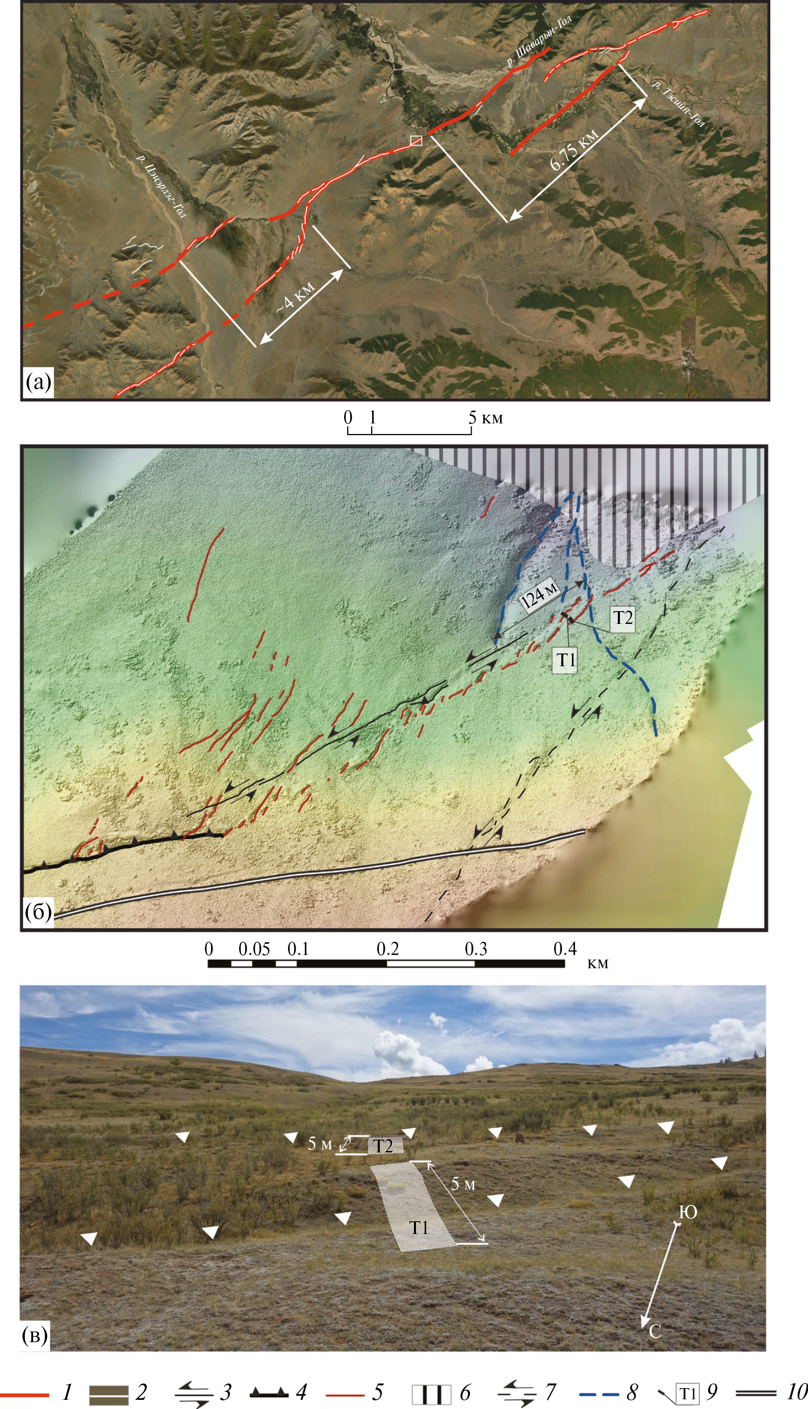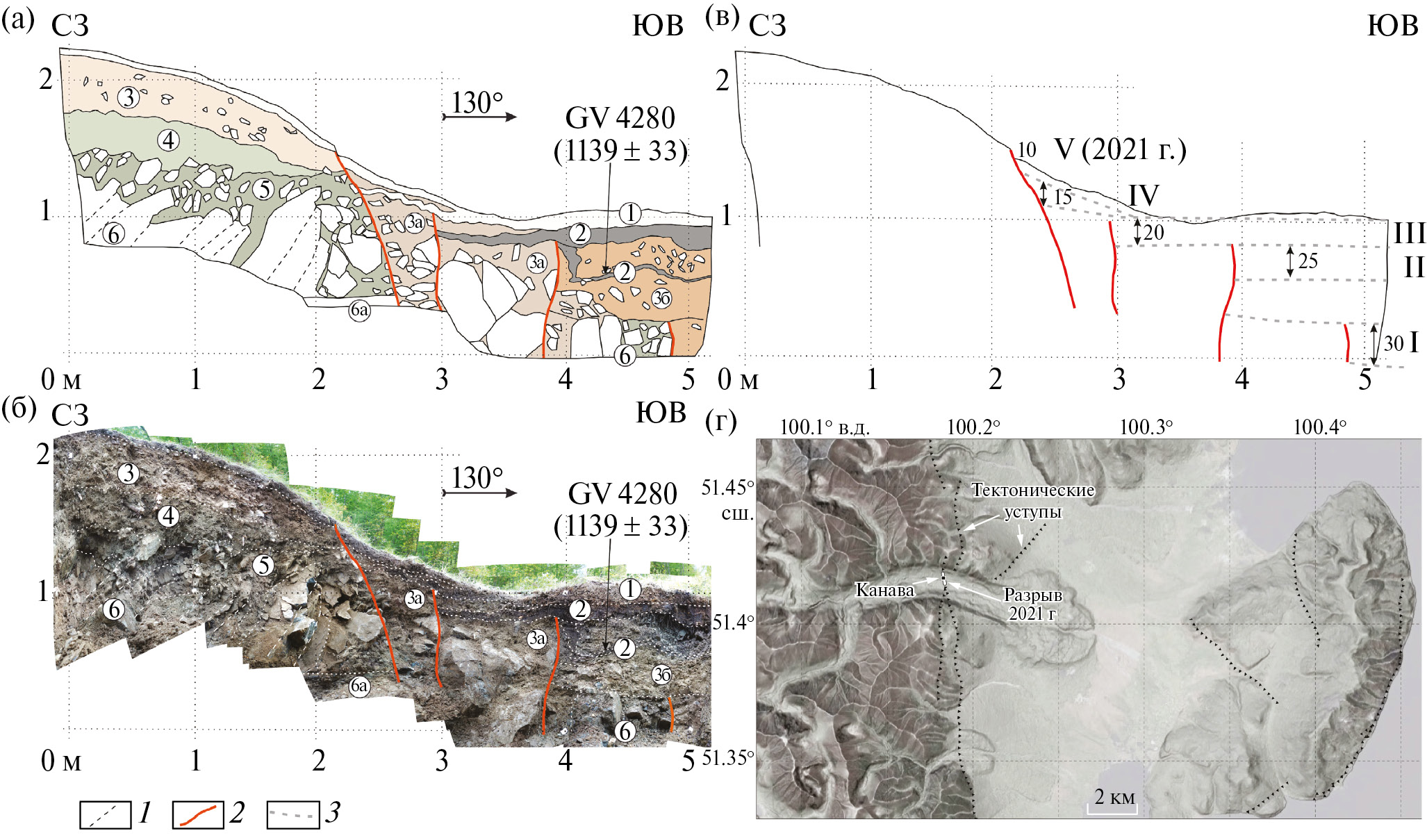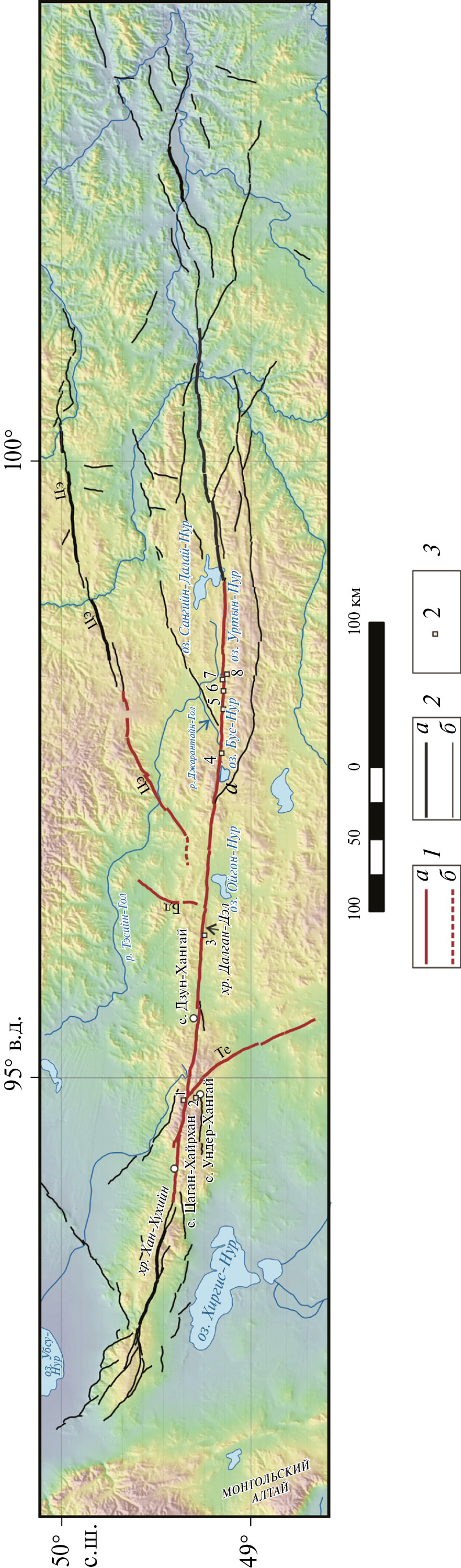 1 – участки Хангайского и оперяющих разломов, активизированные в 1905 г.: а ‒ достоверные, б ‒ предполагаемые; 2 – прочие разломы Хангайской зоны: а ‒ достоверные, б ‒ предполагаемые по результатам анализа космических изображений и модели рельефа; 3 – положение шурфов и их номера