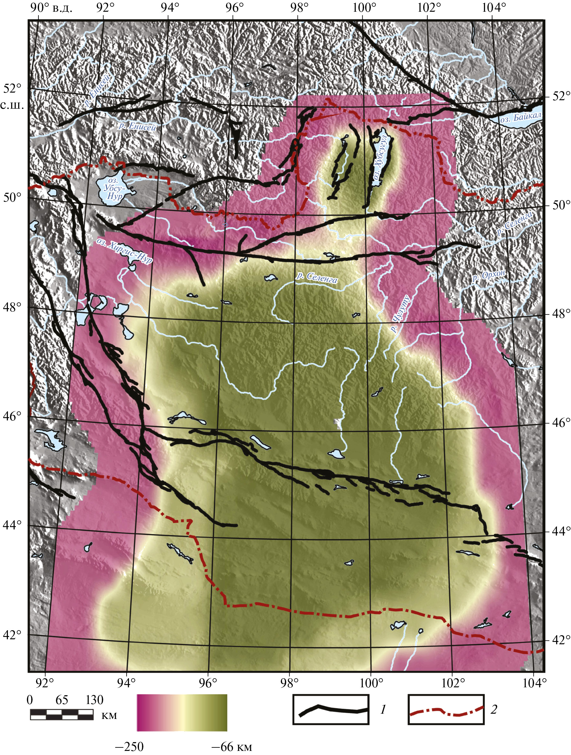 В мантии под рассматриваемым регионом находится область пониженных скоростей сейсмических волн, выделяемая нами как Хангайский плюм. Понижение скоростей может отражать разогрев и разуплотнение мантийных пород. Над осевой частью плюма кровля значительно разуплотненной мантии расположена выше глубины 67 км, что отражает утонение (местами до полного исчезновения) мантийной части литосферы и может обусловливать разупрочнение ее сохранившейся части. Активные сдвиги региона расположены по периферии поднятия низкоскоростной мантии, где мощность прочной литосферы возрастает. В осевой части поднятия сдвиги замещаются зоной сдвиговых деформаций, представленной грабенообразными впадинами. Как показал выполненный транчинг, сильные землетрясения повторялись здесь чаще, чем в зонах сдвигов, но отличались меньшими магнитудами.