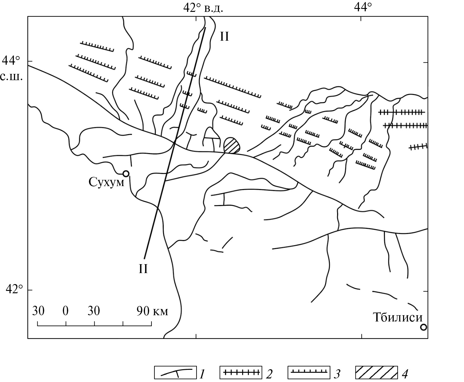 При выборе тектонической концепции для объяснения истории новейшего этапа необходимо учитывать широкое распространение структур, образование которых связано с продольным и поперечным растяжением мегасвода Большого Кавказа [13]. Согласно [10], северные склоны Западного Кавказа могут находиться в состоянии растяжения.