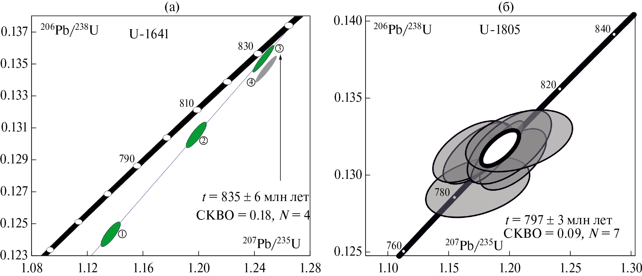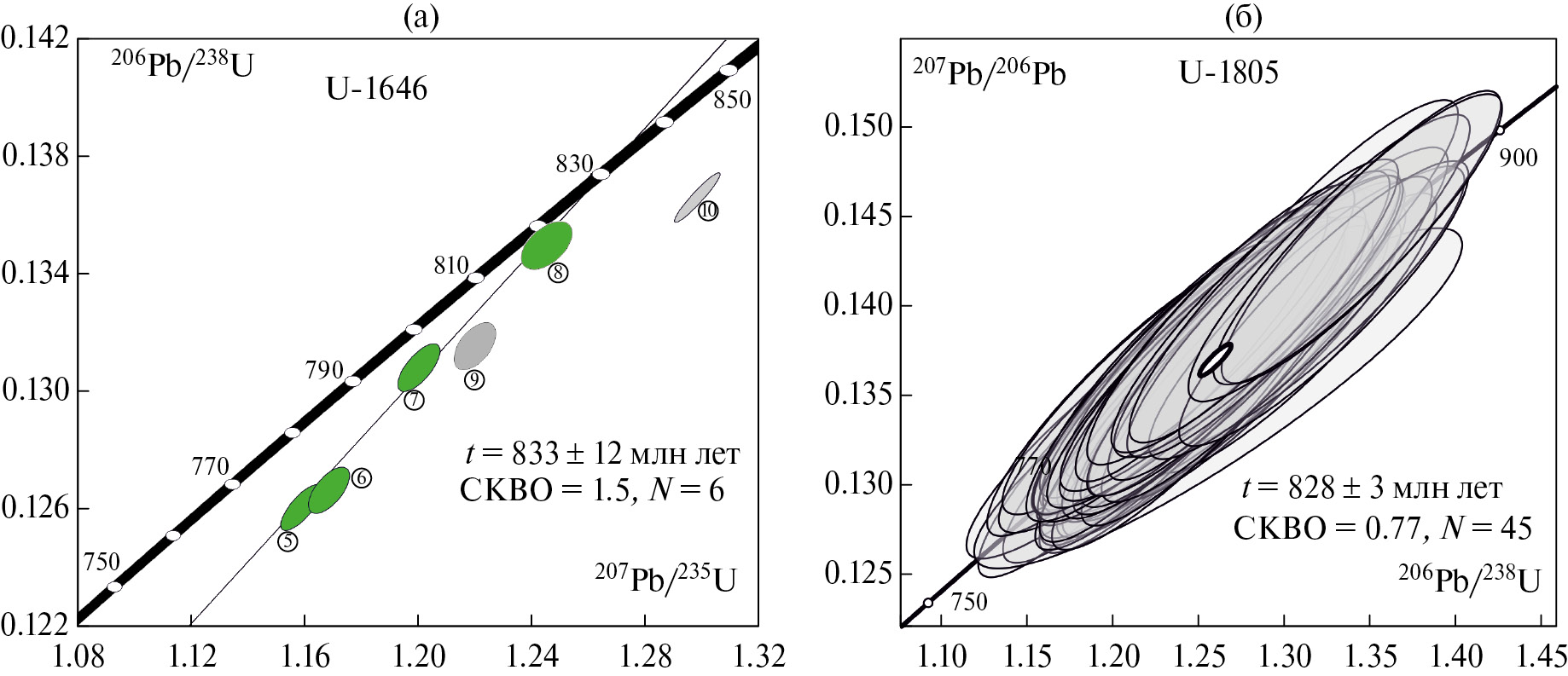 Рис. 7. Диаграммы с конкордией для цирконов: (а) ‒ из трахидацитов (проба U-1646); (б) – для цирконов из кианитовых кварцитов (проба U-1805) Ащи-Тасты – Жаксы-Коянды.
