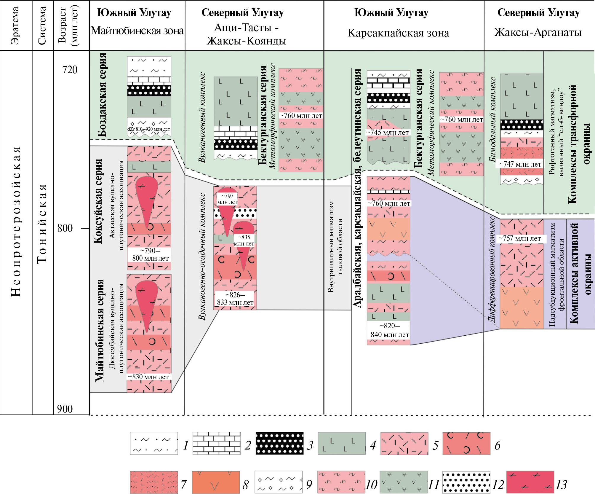 В западной (Майтюбинской) зоне распространены анорогенные вулканогенные и вулканогенно-осадочные толщи кислого состава (майтюбинская и коксуйская серии), входящие вместе с гранитоидами Жаункарского и Актасского комплексов, в состав вулкано-плутонических ассоциаций. Их формирование происходило в интервале 790‒~830 млн лет во внутриплитной обстановке и связано с рифтогенными процессами в тыловой области активной окраины [10]. В восточной (Карсакпайской) зоне распространены дифференцированные, бимодальные вулканогенные и вулканогенно-осадочные толщи (аралбайская и белеутинская серии). Формирование этих комплексов было приурочено к фронтальной области активной окраины (энсиалическая дуга) и связано с двумя этапами надсубдукционного магматизма ~840‒820 и ~760 млн лет [11].