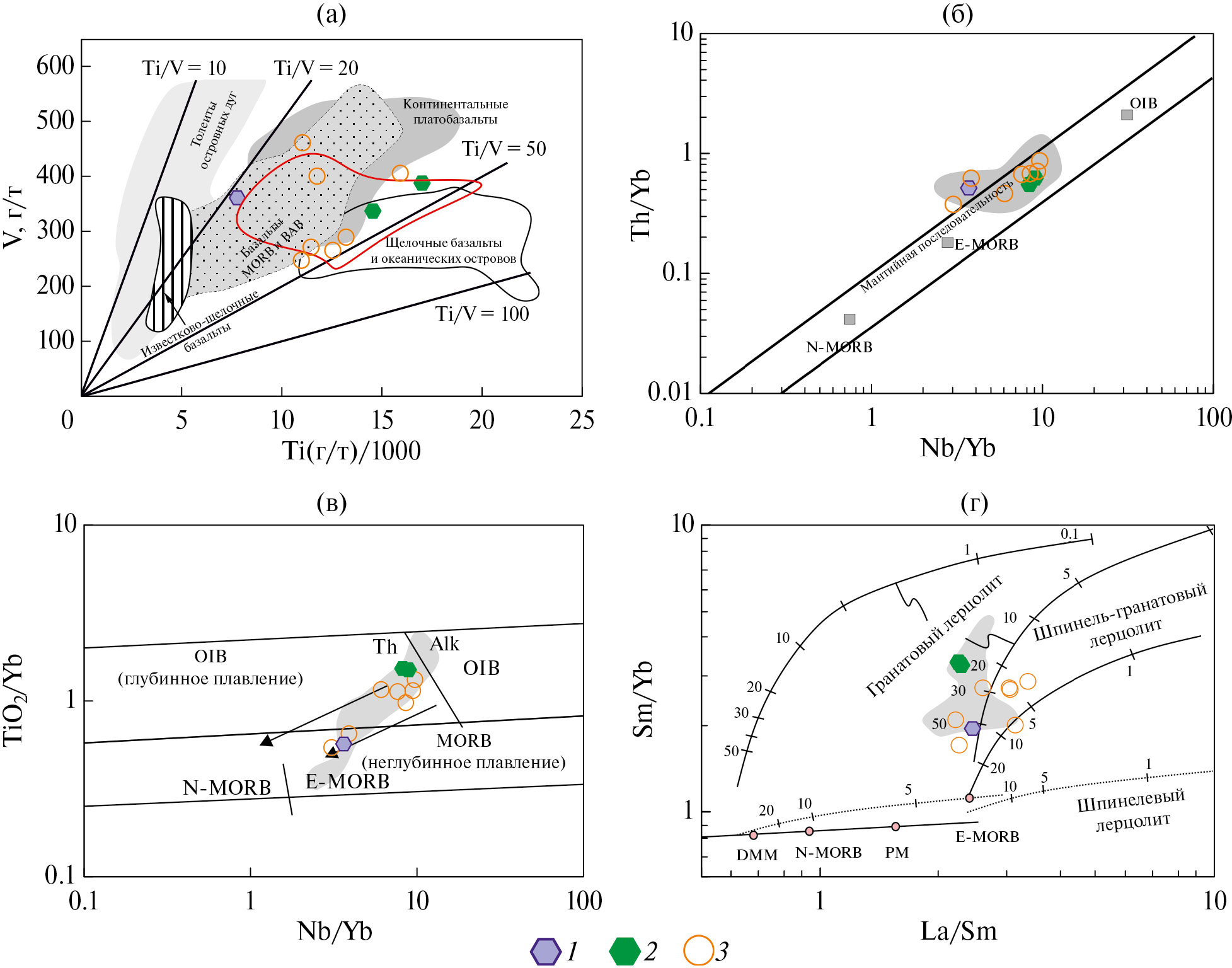 (а) ‒ V‒Ti/1000, (по [36]); (б) ‒ Th/Yb‒Nb/Yb, (по [35]); (в) – TiO2/Yb–Nb/Yb, (по [35]); (г) – Sm/Yb–La/Sm, (по [17]).