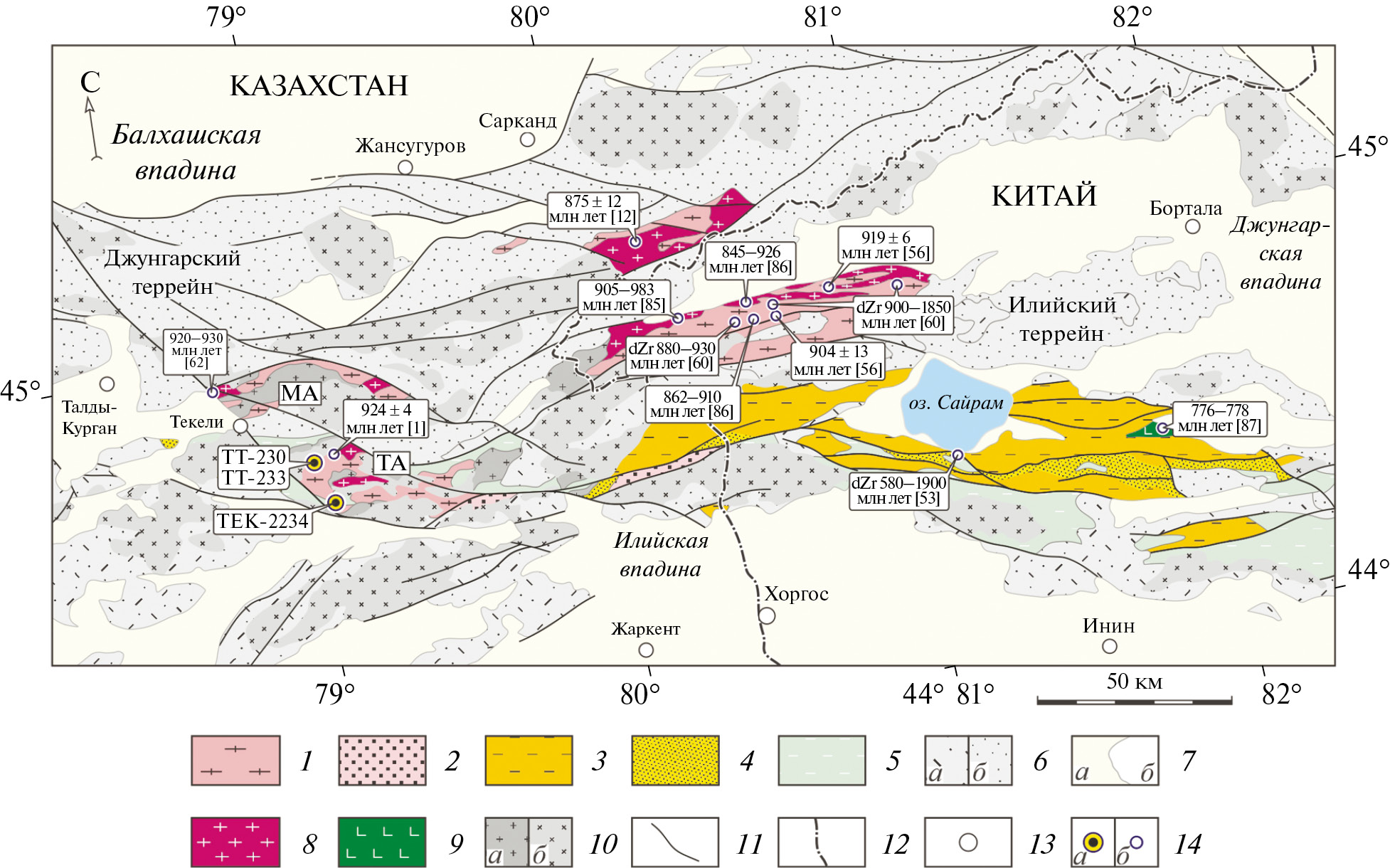1 – мезо- и неопротерозой (сланцы и кварциты сарычабынской серии и комплекса Венчуань); 2 – неопротерозой (терригенные отложения, туфы, риолиты); 3 – неопротерозой (известняки, мрамора и сланцы); 4 – поздний неопротерозой (диамиктиты, песчаники, сланцы и известняки); 5 – нижний палеозой (сланцы и карбонаты); 6 – средний и поздний палеозой: а – вулканиты, б – терригенные отложения; 7 – отложения: а – мезозоя и кайнозоя, б – озера; 8–10 – интрузивные породы: 8 – неопротерозойские гранитоиды, 9 – неопротерозойские габбро и долериты, 10 – граниты: а – раннеполеозойские, б – позднепалеозойские; 11 – разломы; 12 – государственная граница; 13 – города; 14 – датированные образцы и возрасты пород (млн лет): а ‒ полученные данные, б ‒ по данным [1, 12, 56, 60, 62, 85‒87]
