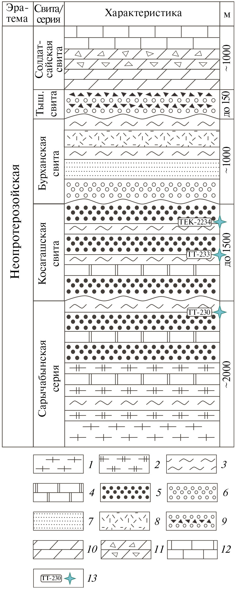 1 – амфиболиты; 2 – гнейсы; 3 – сланцы; 4 – мраморы; 5 – кварциты; 6 – конгломераты; 7 – песчаники; 8 – риолиты; 9 – тиллитоподобные конгломераты; 10 – доломиты; 11 – брекчированные доломиты; 12 – известняки; 13 – номера отобранных проб для U‒Pb изотопно-геохронологических исследований