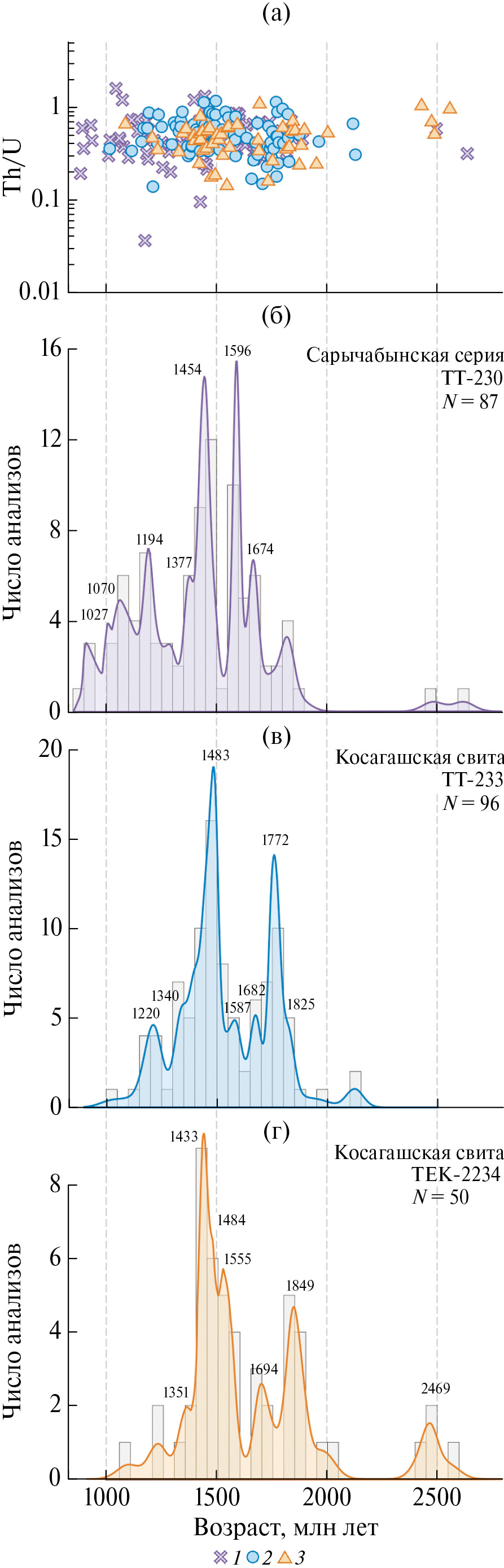 Возраст косагашской свиты считался позднепротерозойским на основании сходства с кварцито-сланцевыми толщами Кокчетавского террейна (кокчетавская серия) и на основе полученных ранее оценок возраста свинцово-изохронным методом (1100‒1300 ± 100 млн лет) [3]. В кварцитах косагашской свиты сохранились реликтовые псаммитовые структуры, а в отдельных случаях выявлена косая слоистость. Значительные деформации и метаморфизм не позволяют достоверно оценить мощности сарычабынской серии и косагашской свиты, которые, вероятно, достигают 1000‒1500 м [3, 4, 16].