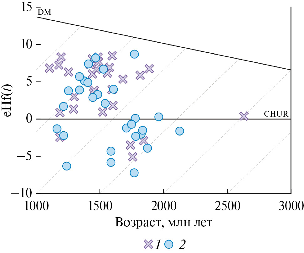 Значения εHf(T) и модельные Hf возраста были рассчитаны с использованием: