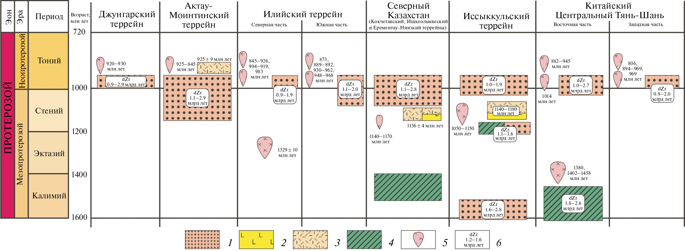 Конкордатные оценки возрастов наиболее молодой популяции обломочного циркона составляют ~1700 млн лет, что указывает на накопление толщ на домезопротерозойском континентальном основании [2, 10, 20]. Позднедокембрийские кварцито-сланцевые толщи распространены на больших площадях и выявлены в пределах террейнов Северного и Центрального Казахстана, Северного Тянь-Шаня и Северо-западного Китая [2, 11, 58, 60‒61, 63, 65, 85, 97].