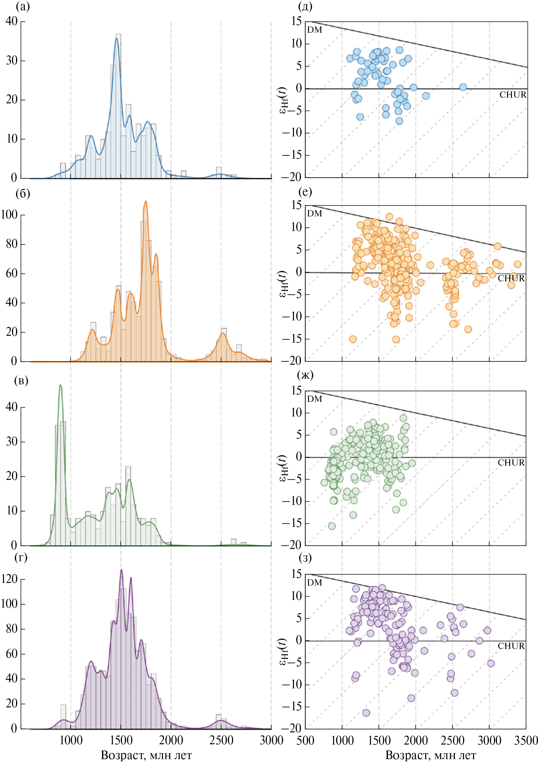 Показано: dZr – возрасты наиболее молодых кластеров обломочных цирконов (по данным [1, 12, 56, 60, 62, 85‒87]).