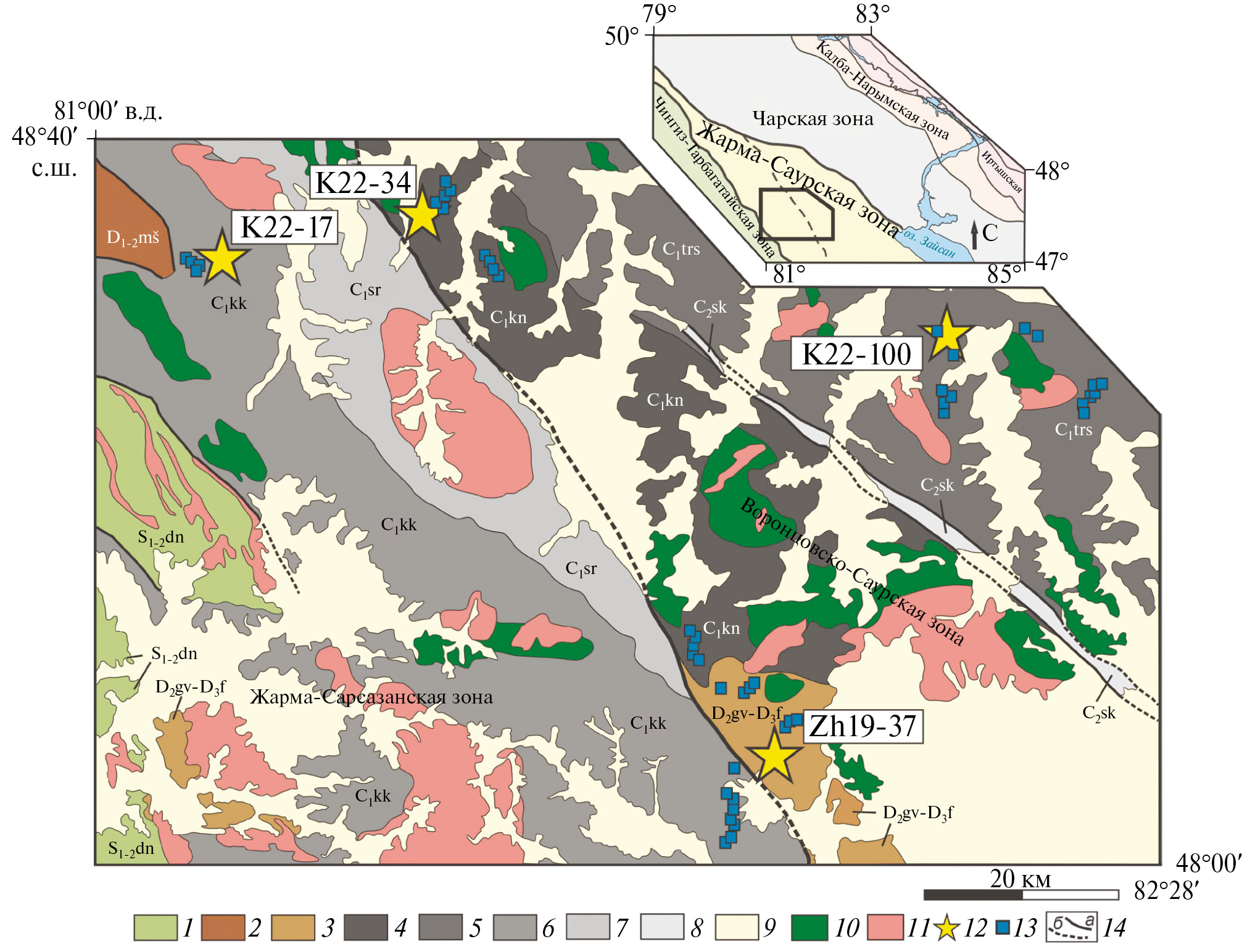 1–2 – нижне-среднепалеозойские вулканогенно-осадочные отложения в зонах: 1 – Чарская (O3‒D2-3), 2 – Чингиз-Тарбагатайская (O‒S); 3 – нижне-среднедевонские вулканогенные отложения среднекислого состава (D1-2); 4–5 – средне-верхнепалеозойские вулканогенно-осадочные отложения в зонах: 4 – Жарма-Саурская (D2-3‒С1t-v), 5 – Рудно-Алтайская (D2‒С1t); 6 – девон‒каменноугольные осадочные отложения Калба-Нарымской зоны; 7–8 – нижнекаменноугольные вулканогенно-осадочные отложения Жарма-Саурской зоны: 7 – коконьской и сиректасской свит нерасчлененные (С1t-v), 8 – кояндинской и терсайрыкской свит нерасчлененные (С1); 9 – осадочные отложения (С1); 10 – моласса (C2); 11 – меланж Иртышской зоны смятия; 12 – серпентинитовый меланж в Чарской зоне; 13 – кайнозойские отложения; 14 – крупные разломы; 15 – структурные границы зон и подзон