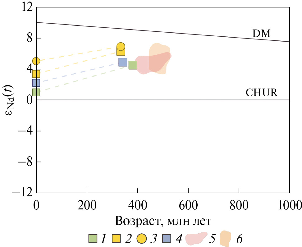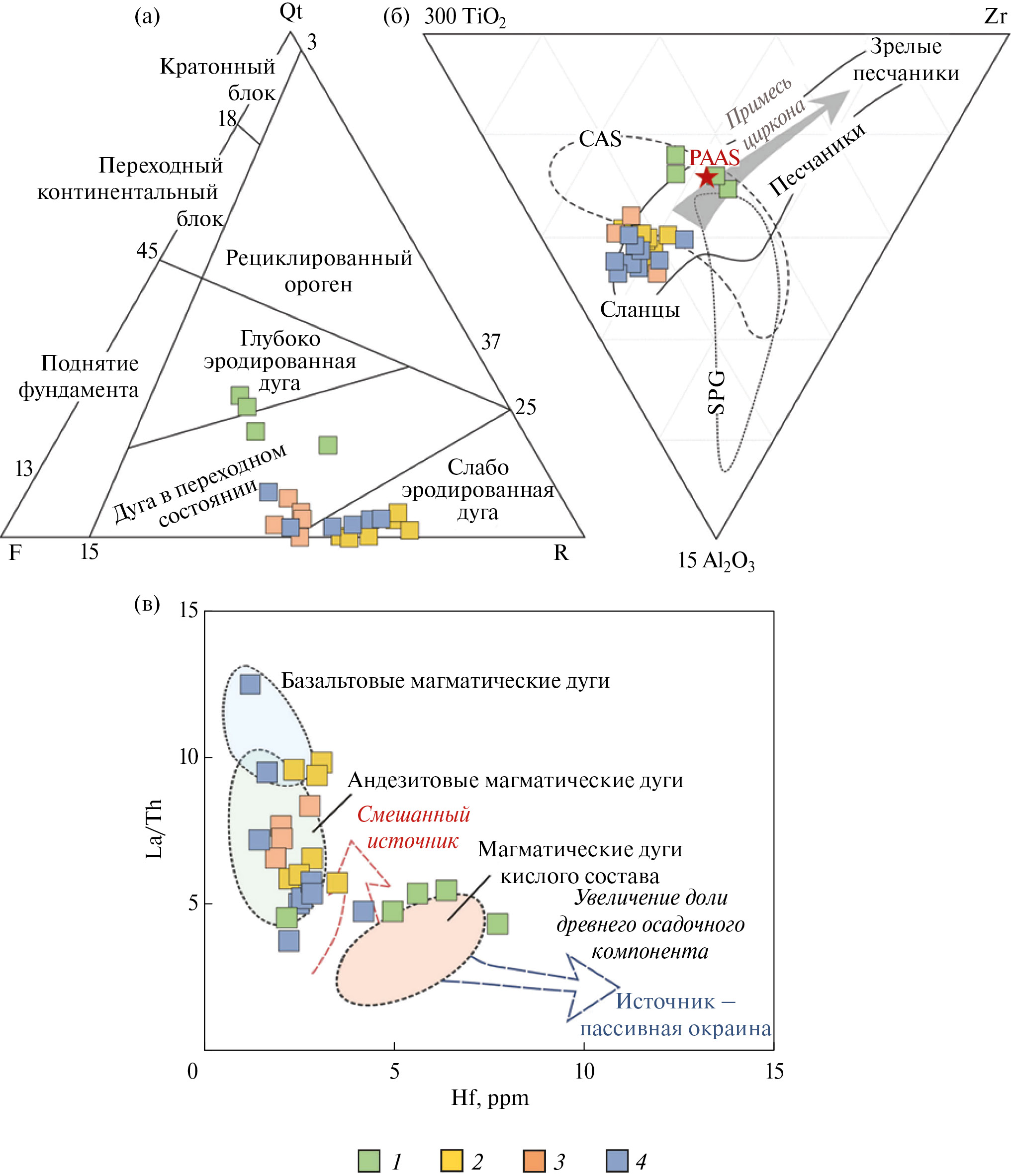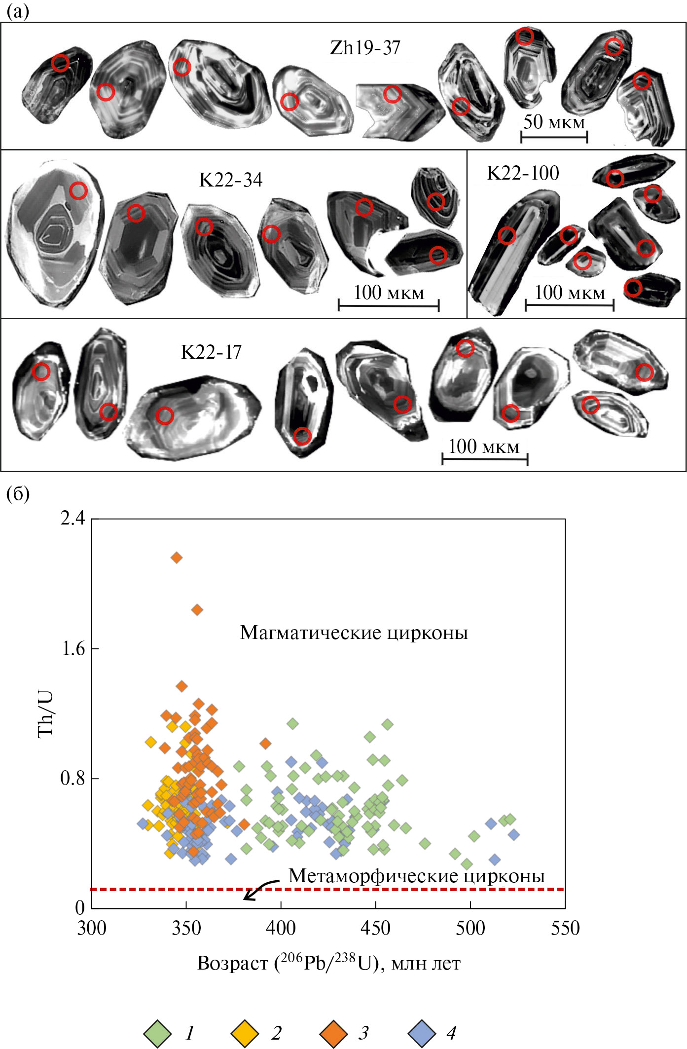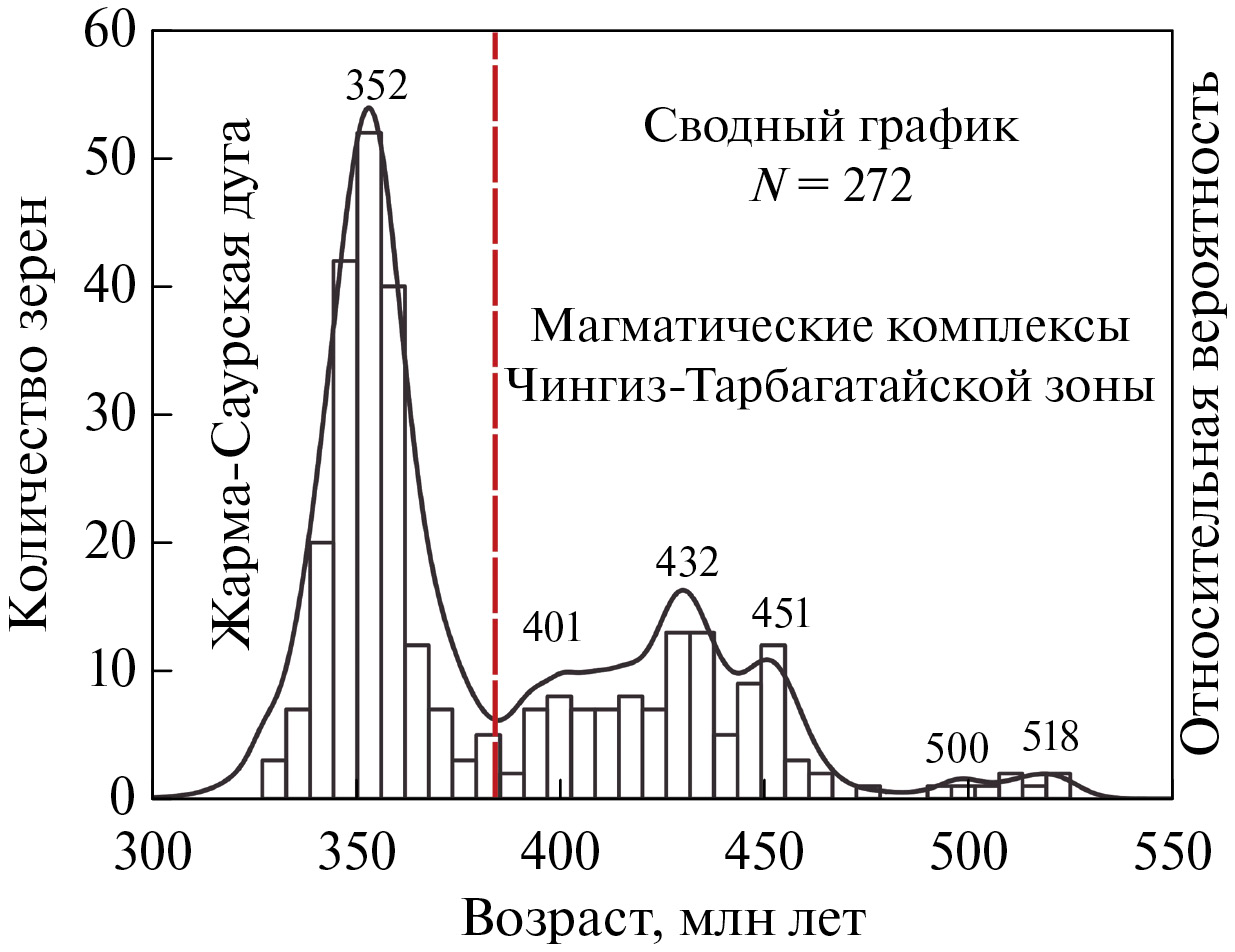 По результатам U‒Pb датирования детритовых цирконов формирование средне-позднедевонских песчаников (живет‒фран) Жарма-Саурской островодужной зоны происходило вследствие разрушения раннепалеозойских источников, а возрастные пики совпадают с этапами вулканической активности и гранитообразования в пределах Чингиз-Тарбагатайской зоны [9] (см. рис. 13).