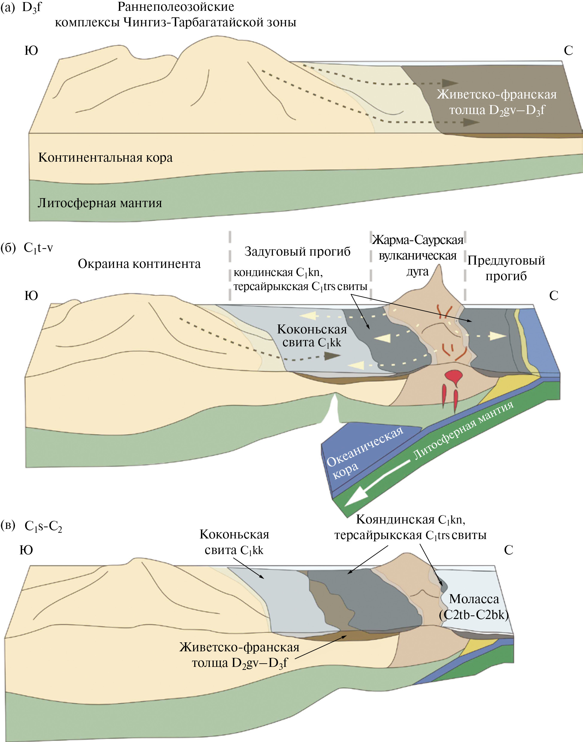 Согласно другим геодинамическим моделям заложение Жарма-Саурской дуги произошло в позднедевонское-раннекаменноугольное время при субдукции литосферы Обь-Зайсанского океанического бассейна в направлении под северо-восточную окраину Казахстанского палеоконтинента, то есть в южном направлении в современных координатах [7, 11, 41, 58, 64].