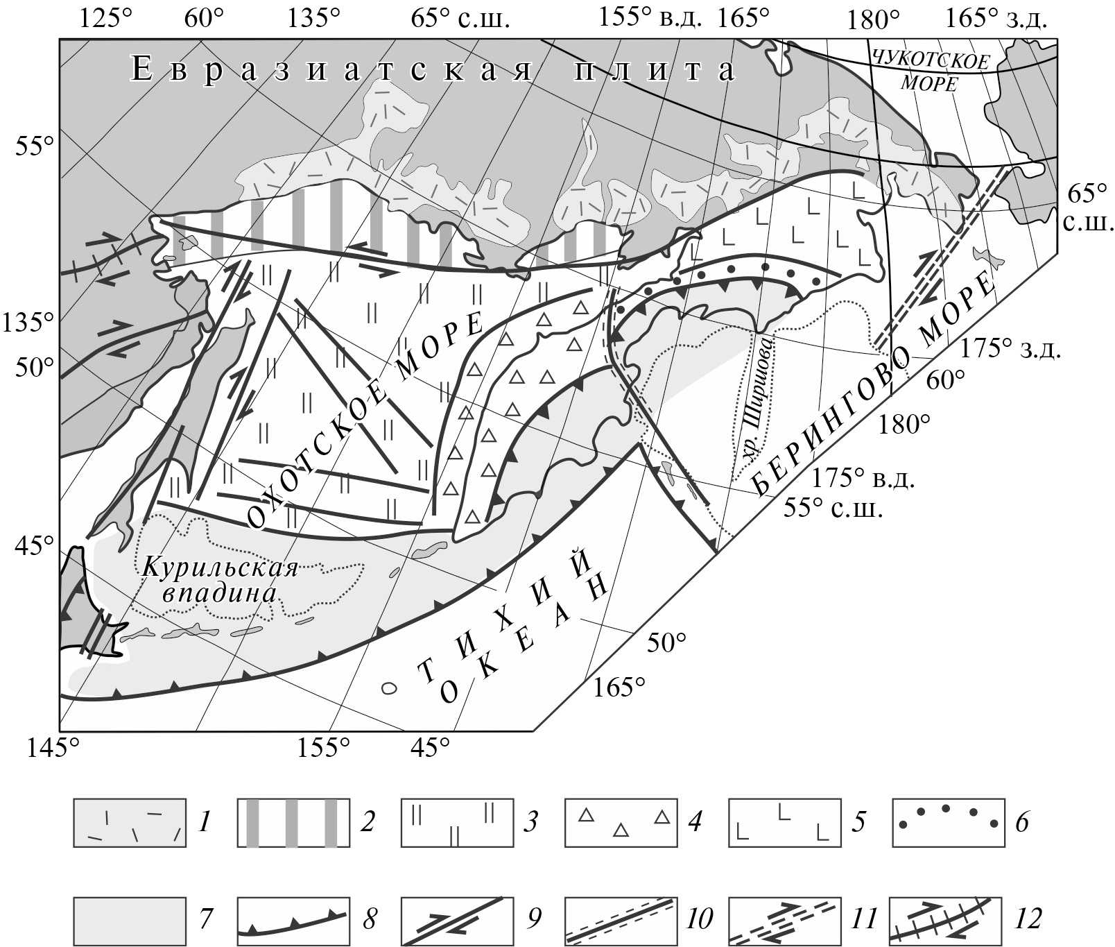 1 – Охотско-Чукотский вулканический пояс (верхний альб‒средний кампан); 2 – континентальная кора под уровнем моря; 3‒4 ‒ супертеррейны: 3 – Охотоморский, 4 – Западно-Камчатский; 5 – супертеррейн Северной Корякии; 6 – Учхичхильский супертеррейн и Лесновско-Укэлаятский флиш; 7 – область Немуро-Олюторских островодужных террейнов и новообразованных кайнозойских структур; 8 – надвиги; 9 – сдвиги; 10 – Палано-Озерновская трансформная зона; 11 – трансформная граница Евразийской и Северо-Американской литосферных плит; 12 – Монголо-Охотская сутура