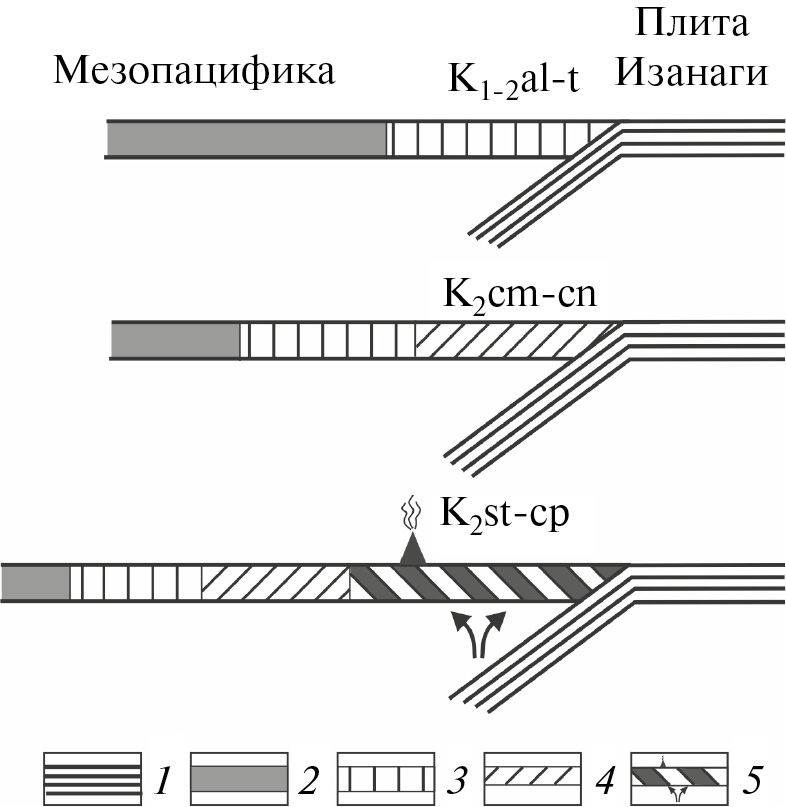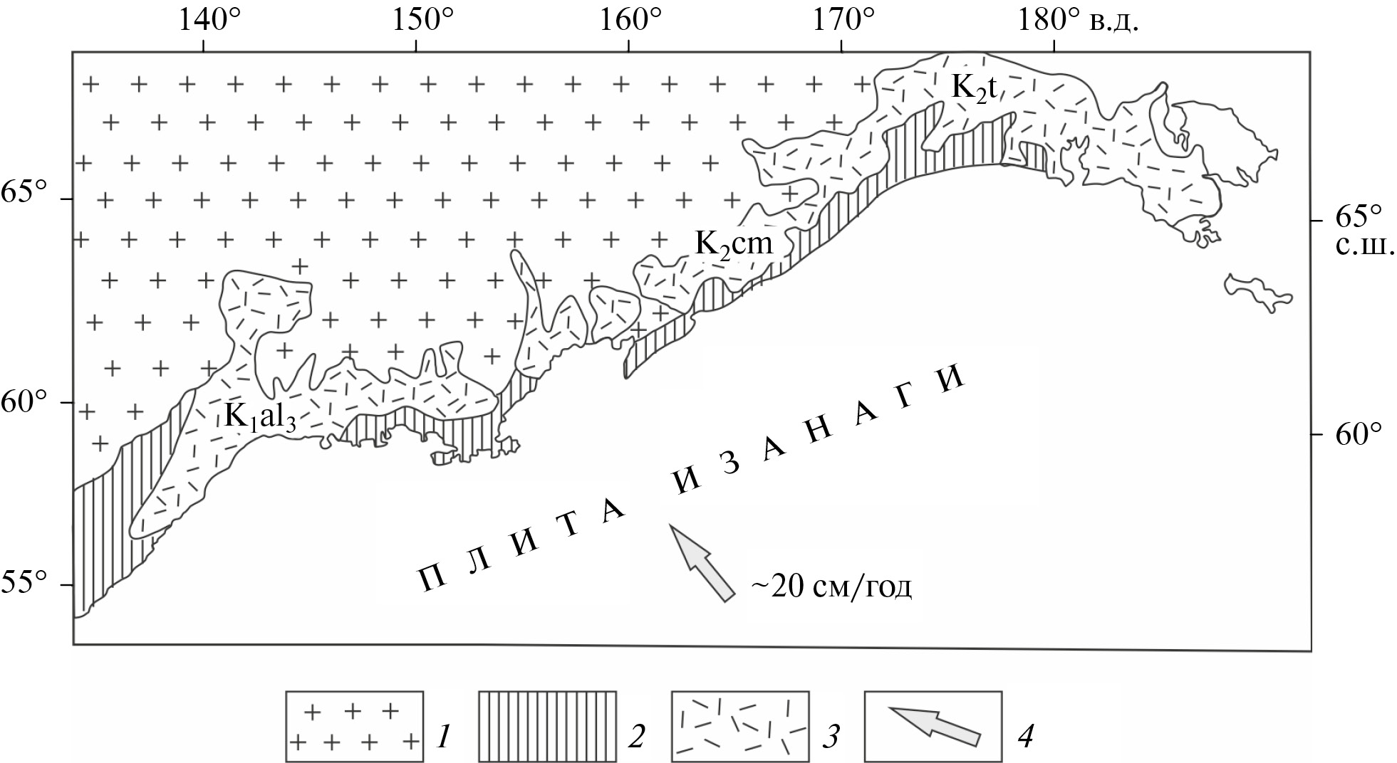 1 – Евразийский континент; 2 – Удско-Мургальская позднеюрская–раннемеловая вулканическая дуга; 3 ‒ Охотско-Чукотский окраинно континентальный вулканический пояс; 4 – направление перемещения океанической плиты Изанаги в позднем мелу