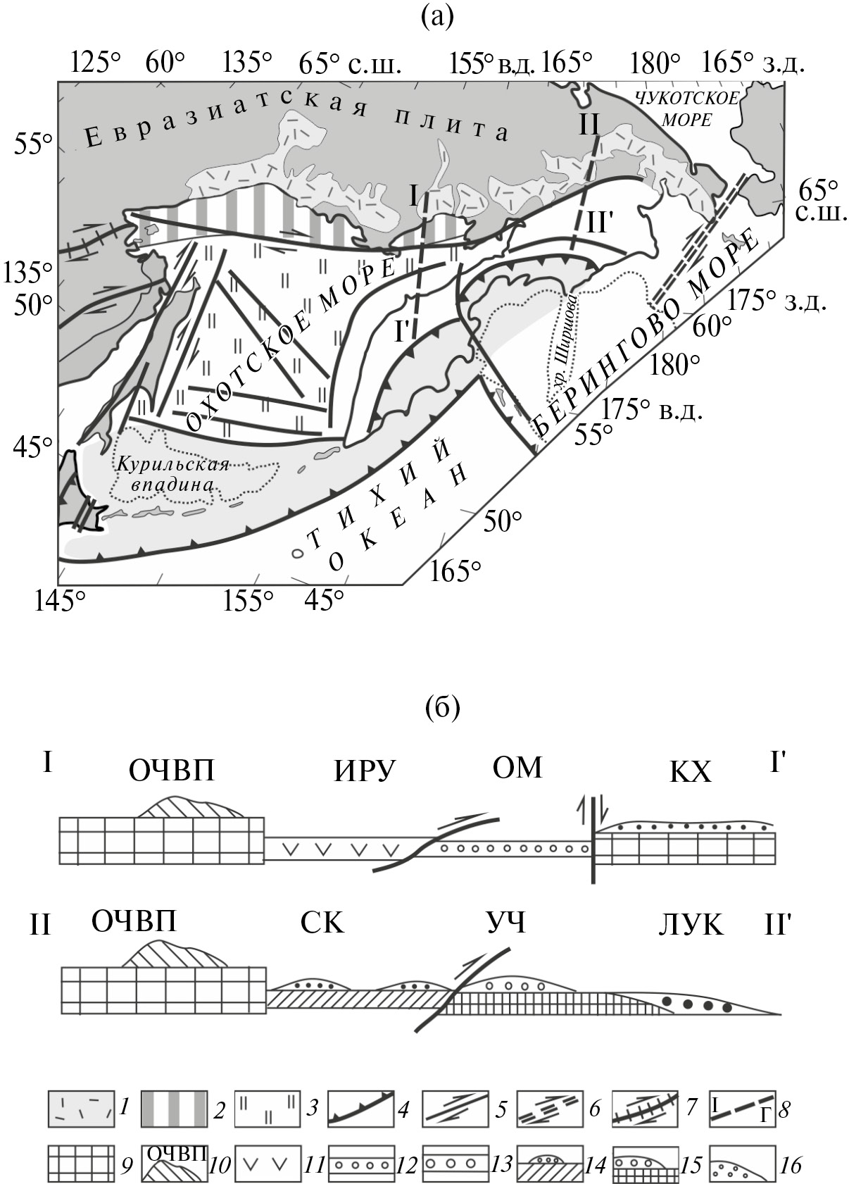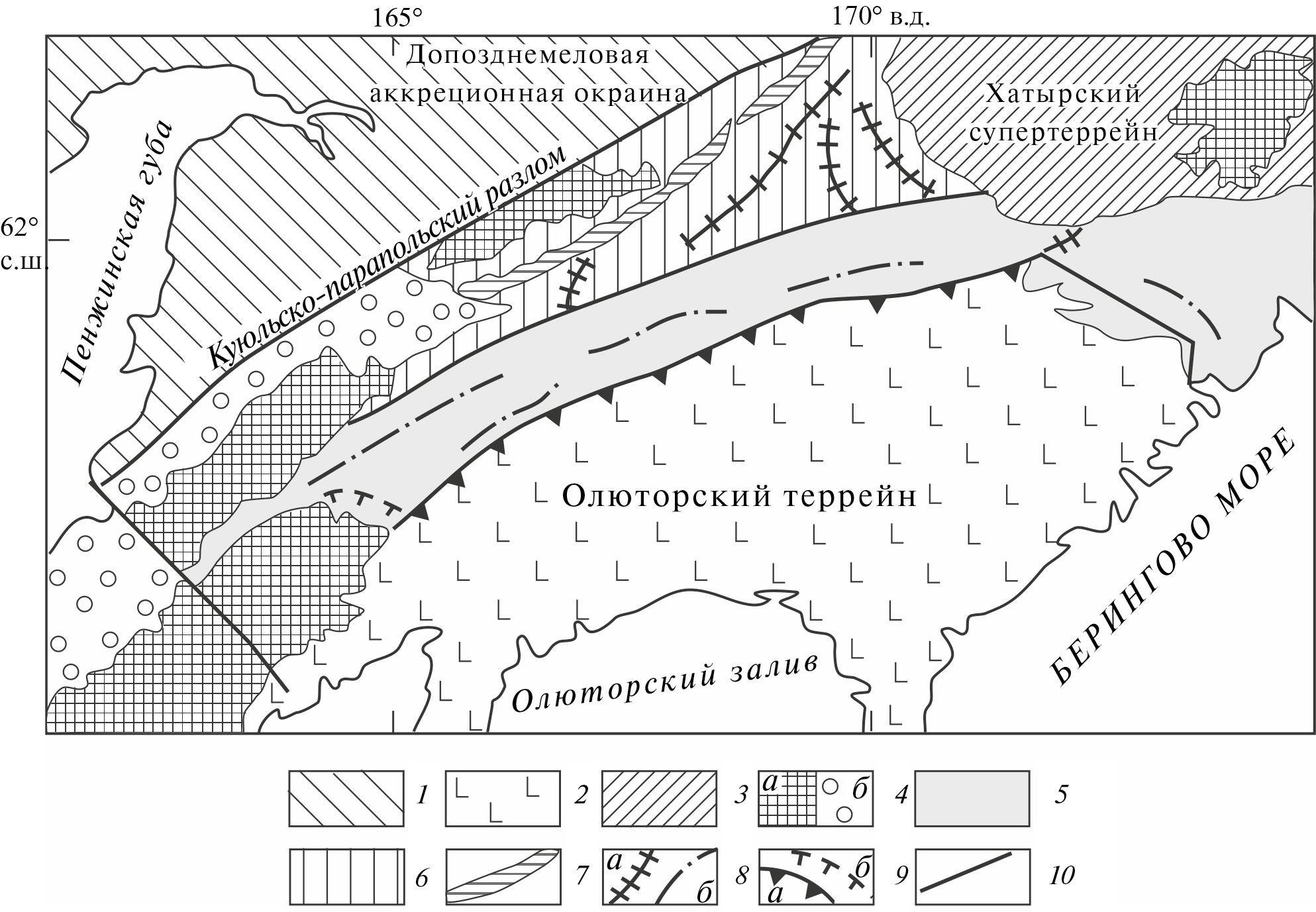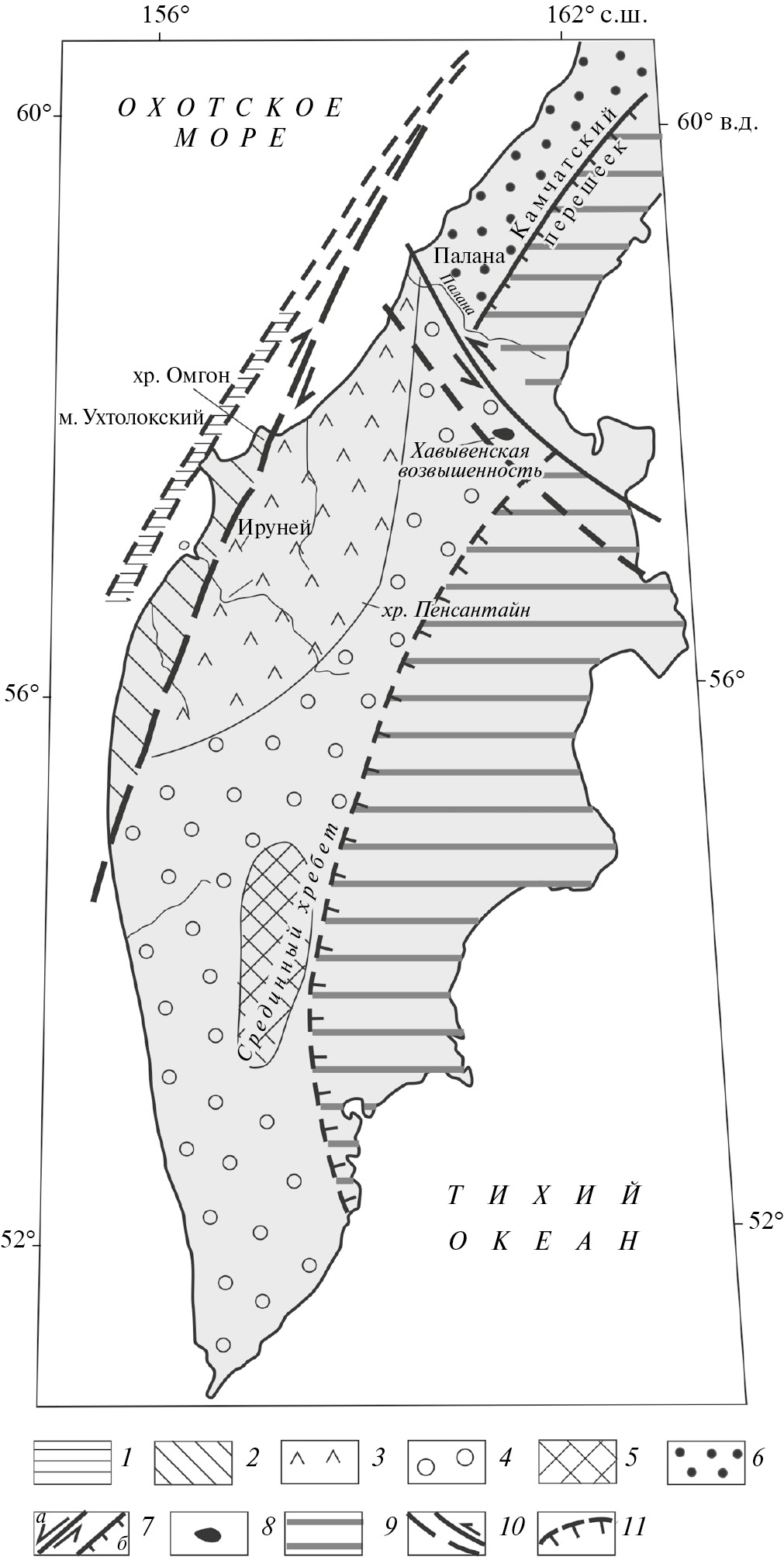 1‒4 – структурно-вещественные комплексы: 1 ‒ долиненский позднеюрско‒раннемеловой кремнисто-базальтовый; 2 – Омгонский терригенный альб‒кампанский, 3 – Ирунейский вулканогенно-кремнистый альб–турон–раннемаастрихтский, 4 – Кихчикский терригенный альб–раннекампанский; 5 – гранитизированные толщи Кихчикского комплекса; 6 – лесновский кампан–раннеэоценовый флишевый комплекс; 7 – разломы: а ‒ сдвиги, б ‒ надвиги; 8 – позднемеловые ультрамафиты Хавывенской возвышенности; 9 – аккреционная область Восточной Камчатки; 10 ‒ Палано-Озерновская сдвиговая зона; 11 ‒ граница аккреционной области Восточной Камчатки