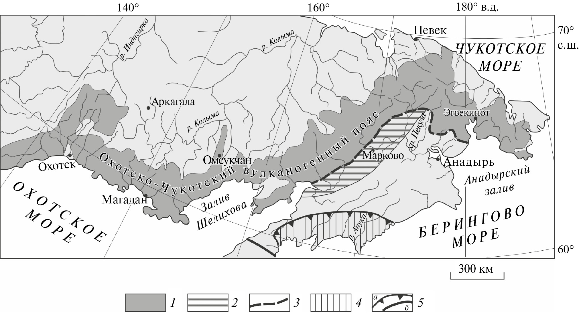Очень важной особенностью Охотско-Чукотского вулканогенного пояса является продольная разновременность начала его формирования – на западе это отвечает позднеальбскому времени, в центральной части – сеноману, а на востоке – турону, т.е. с разницей до 5‒7 млн лет [60]. Этот факт явно противоречит предположению о начале субдукции за счет океанической литосферы Пацифики, учитывая соотношение по нормали между ориентировкой ОЧВП и направлением перемещения океанической плиты Изанаги [1, 14, 84, 107] (рис. 2).
