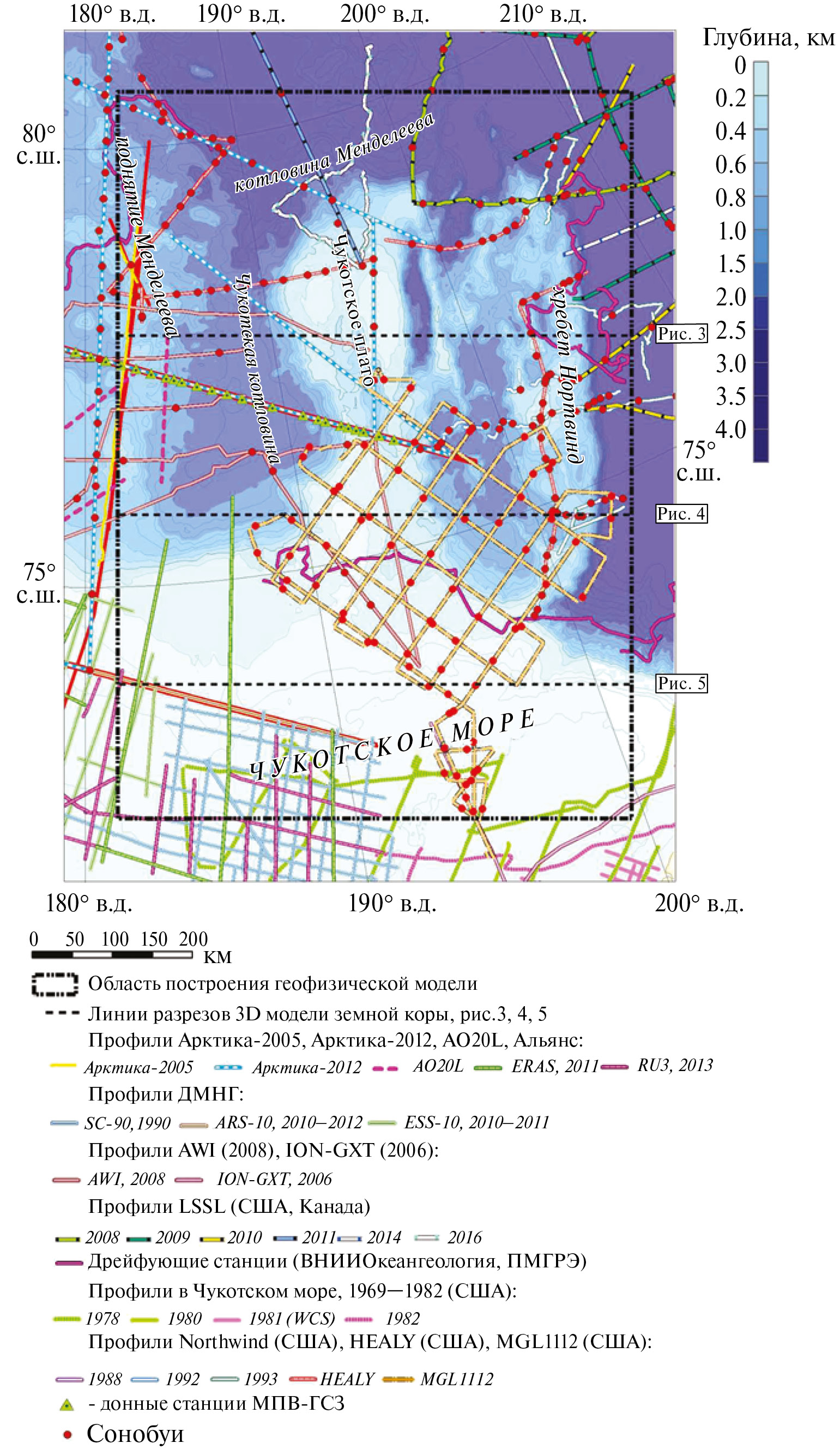Рис. 1. Батиметрическая карта Чукотского бордерленда и прилегающей части шельфа Чукотского моря сейсмические данные, использованные при 3D-моделировании (по данным [14])