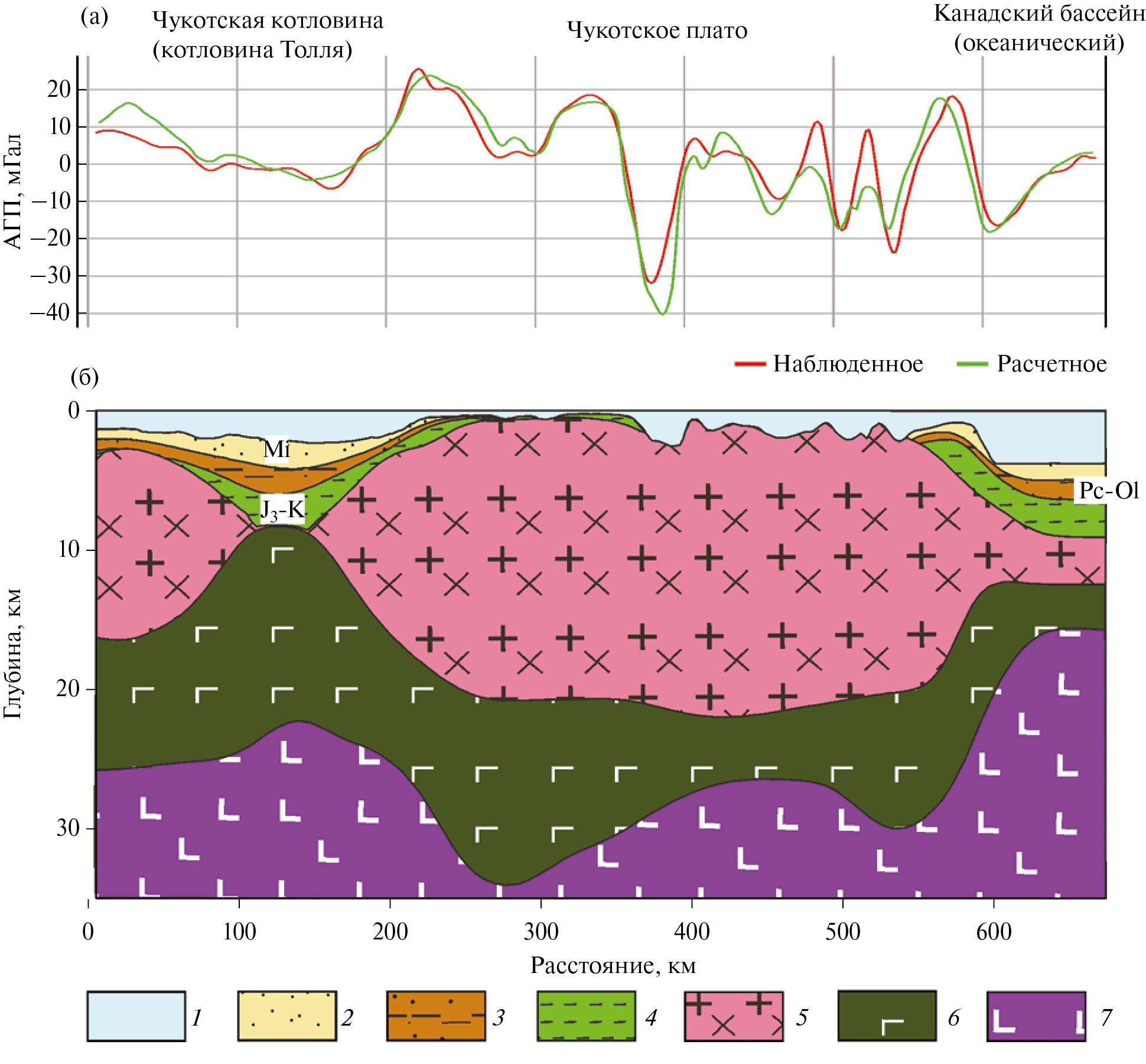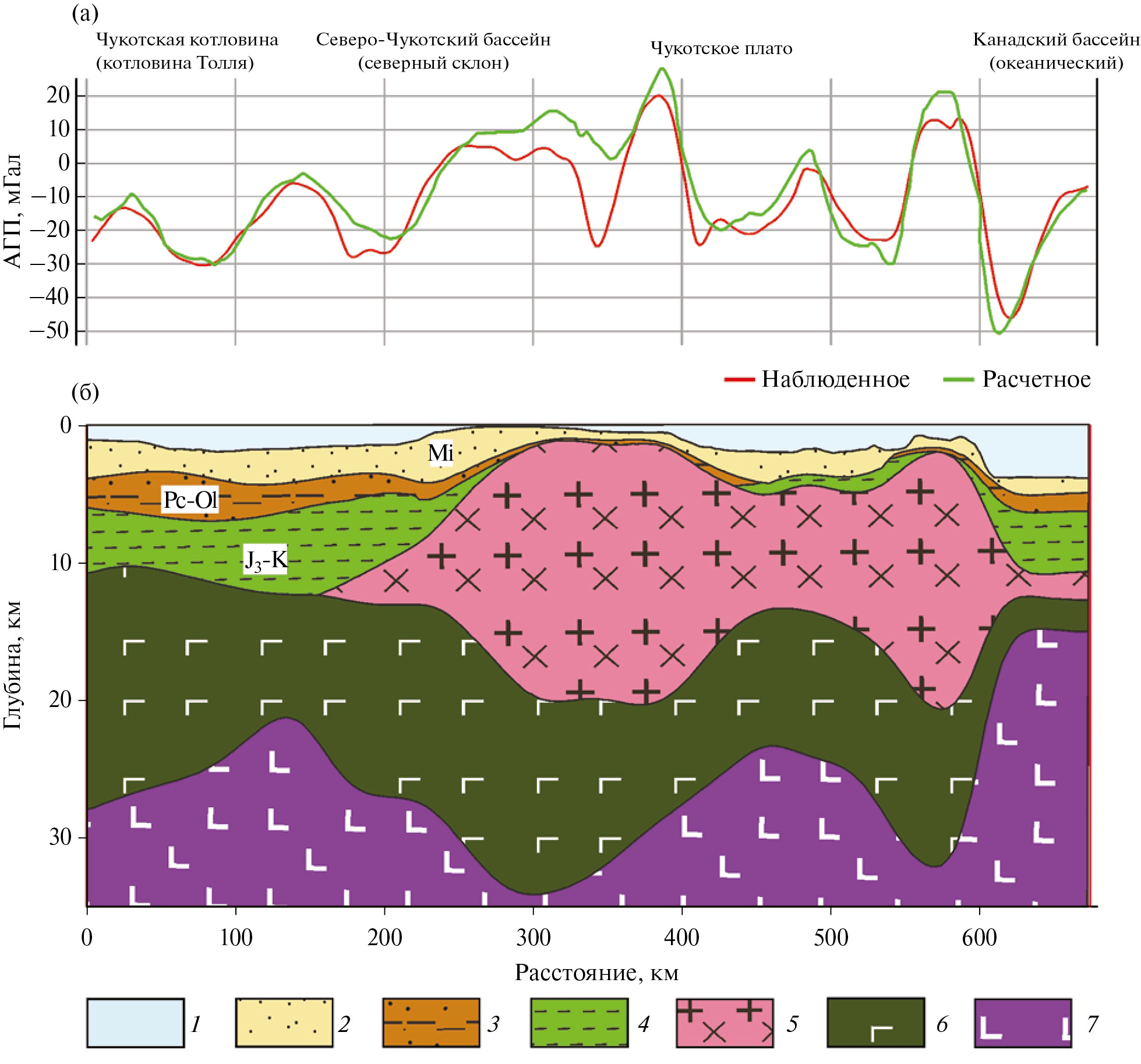 Аномалии, наблюдаемые в контактной с Чукотским поднятием (хребтом Нортвинд) зоне, соответствуют представлениям о последовательном развитии в этой зоне сначала надвига, а затем ‒ сдвиговой зоны [8, 21]. Область растянутой континентальной коры Канадского бассейна в магнитном поле характеризуется отсутствием характерных для океанической коры линейных магнитных аномалий. В гравитационных аномалиях, как и в рельефе, четко выражена граница, отделяющая область от шельфового бассейна Колвилл. Сохранившаяся кристаллическая часть земной коры этой области имеет мощность всего 3‒4 км (см. рис. 4).
