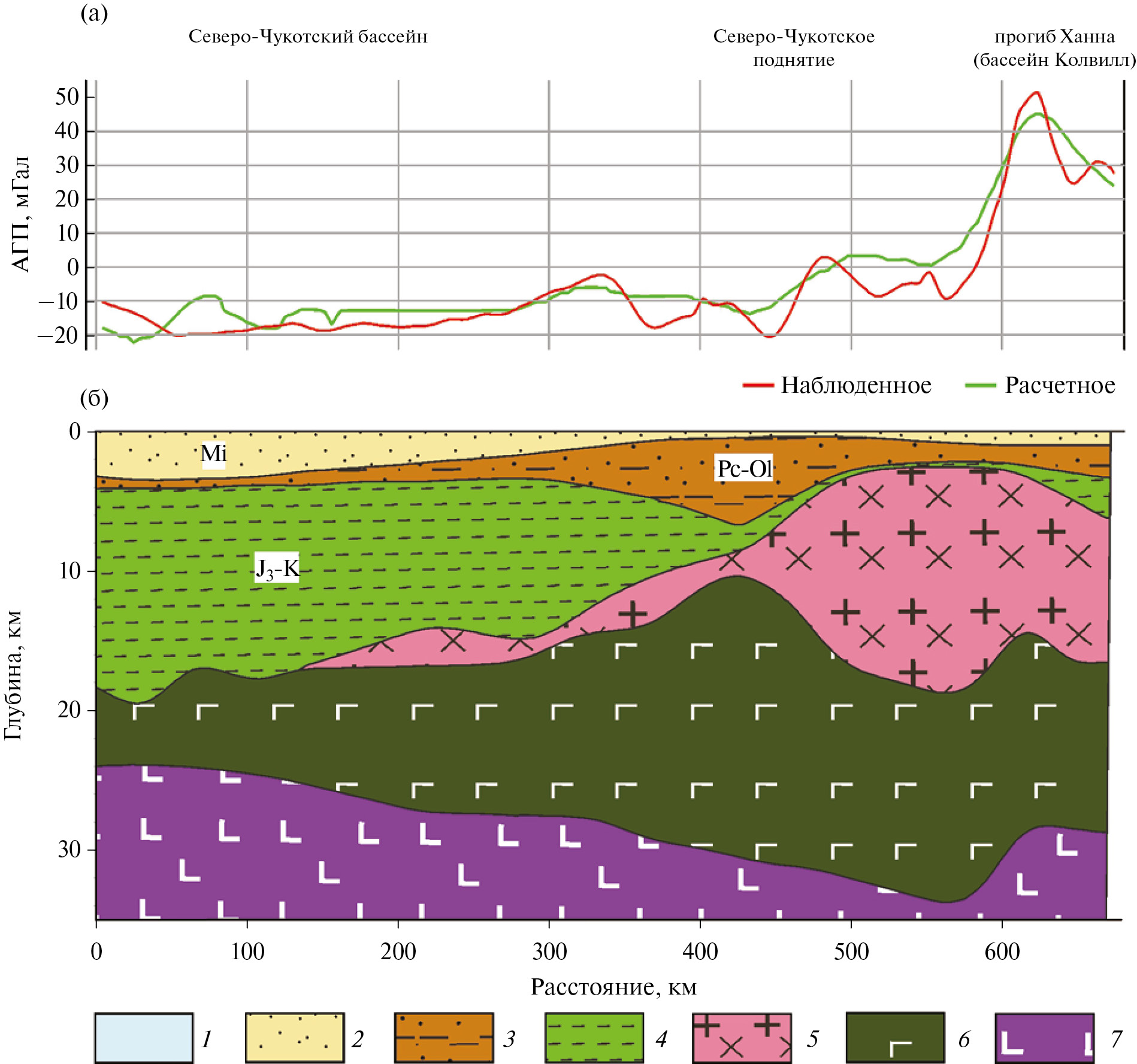 ‒ высокоамплитудная положительная гравитационная аномалия, обусловленная постепенным уменьшением в направлении на северо-восток мощности осадочного чехла (см. рис. 8, 5);