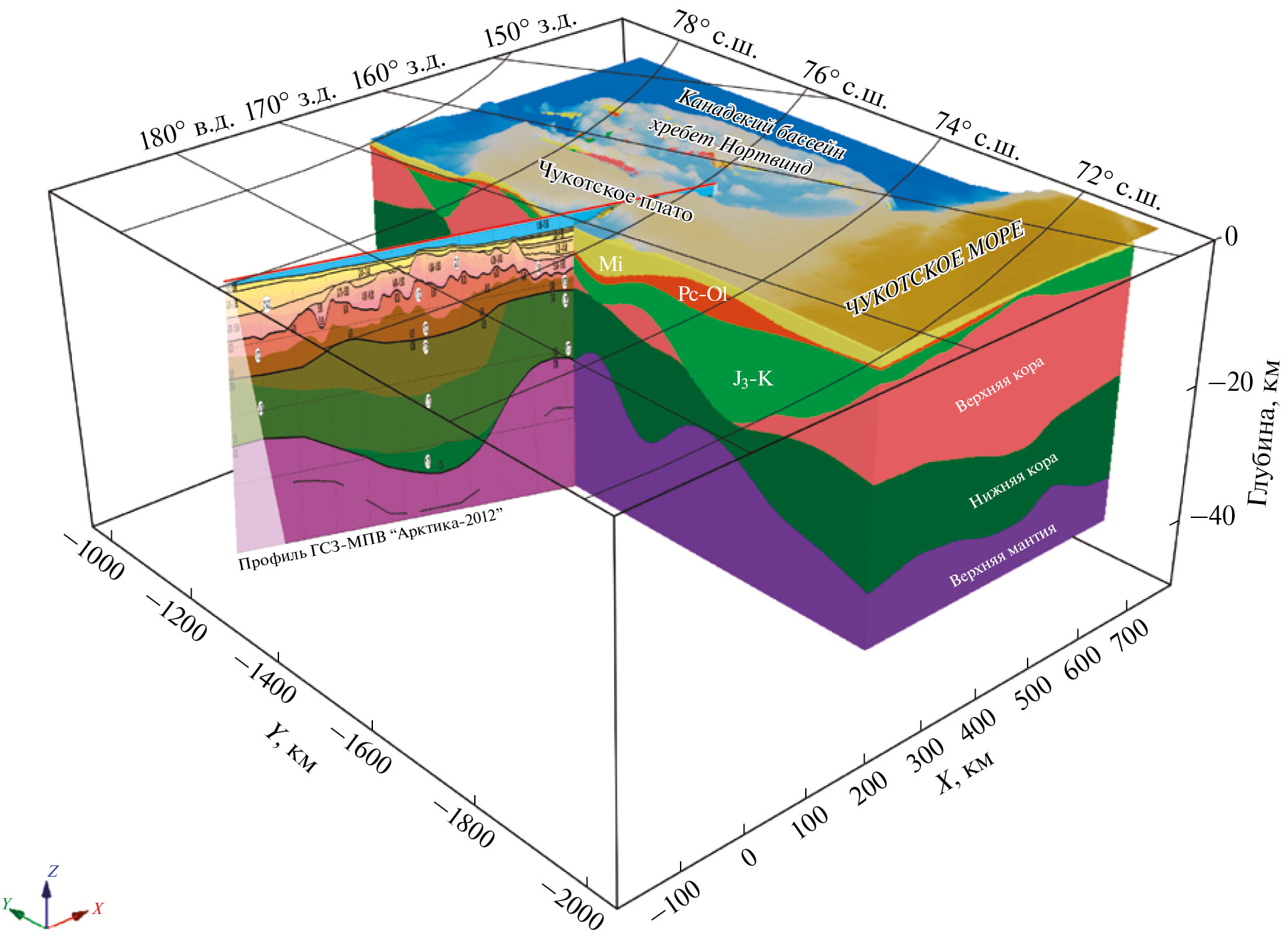 При построении модели использованы данные расчетов 2D моделей в регионе, в частности 2D модели вдоль профиля, пересекающего Поднятие Менделеева, Чукотскую котловину и Чукотское плато, построенной во ВСЕГЕИ (г. Санкт-Петербург, Россия) по результатам наблюдений в экспедиции «Арктика-2012» [22]. По данным этой модели в структуру Чукотской впадины входят: