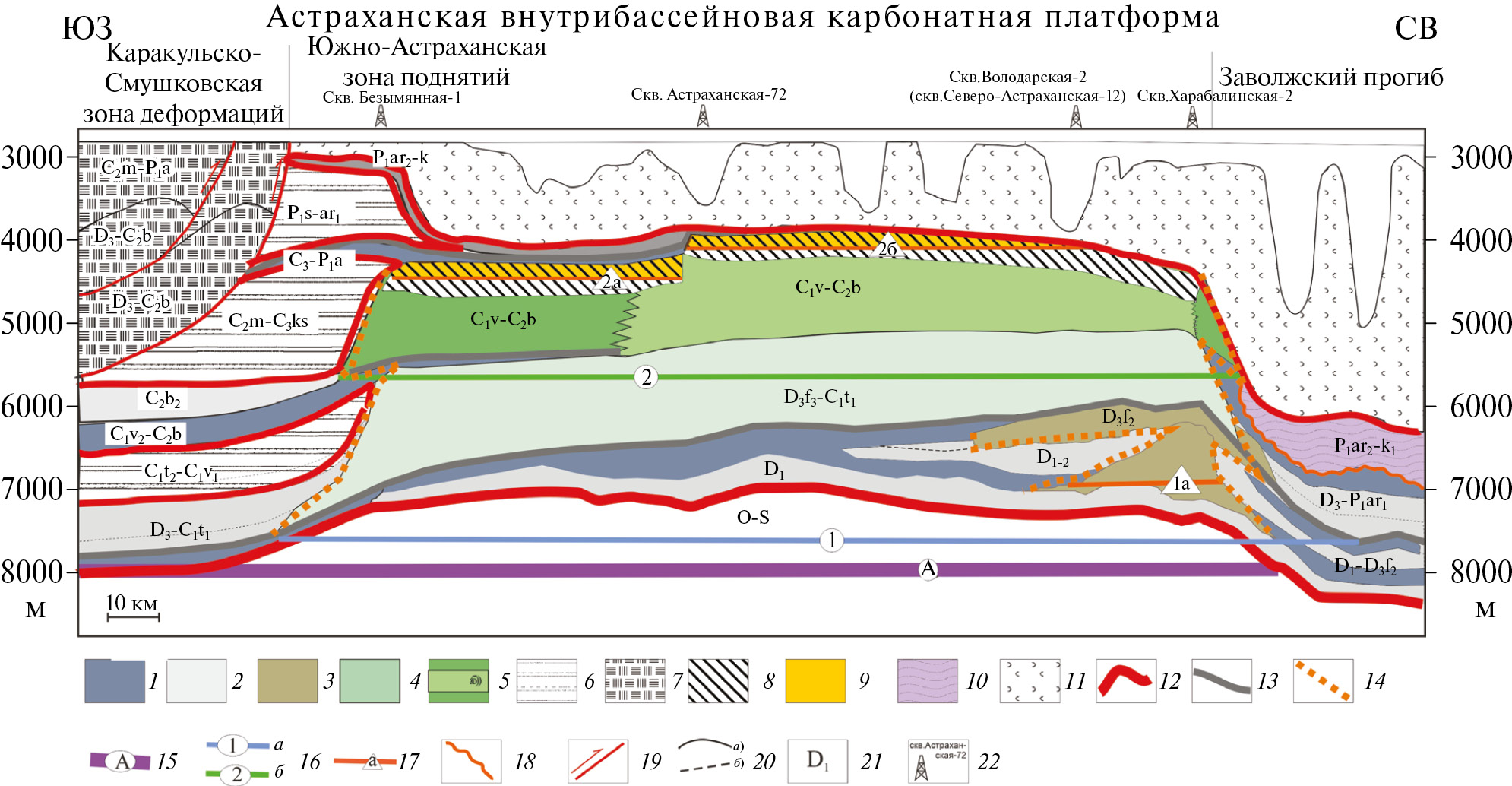 Астраханское газоконденсатное месторождение расположено на внутрибассейновой карбонатной платформе раннедевонско‒башкирского возраста (рис. 2).