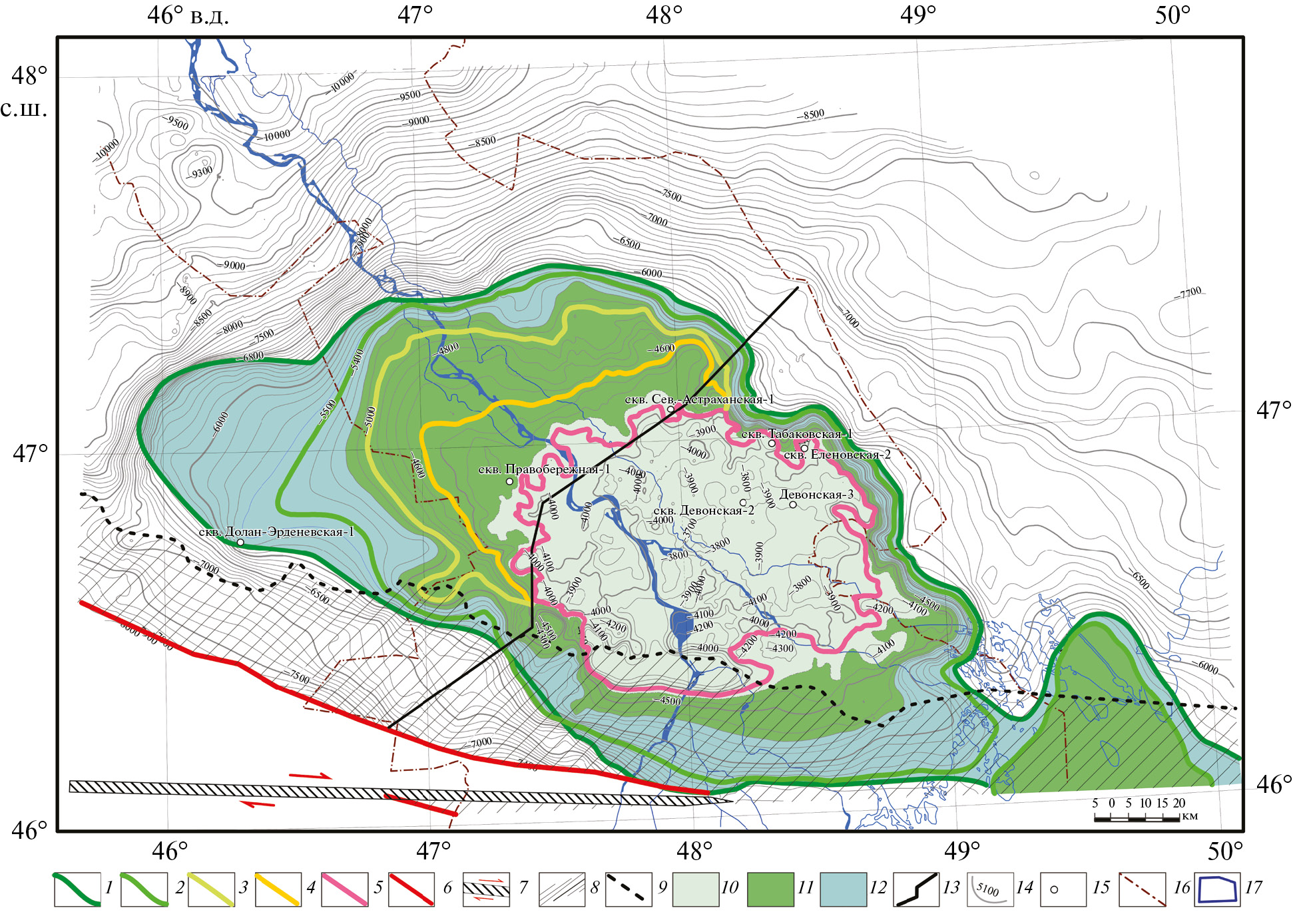 1 – внешний контур девонско‒раннебашкирской внутрибассейновой карбонатной платформы; гидродинамические замки́ (2–5): 2 – визейско‒нижнебашкирского нефтегазоносного комплекса, 3‒4 – литологически экранированной ловушки клинотемы: 3 ‒ нижней, 4 – верхней, 5 – ловушки сводового типа (Северо-Астраханская), приуроченной к дезинтегрированной толще в кровле ундоформы визейско‒раннебашкирской карбонатной платформы; 6 – граница кряжа Карпинского; 7 – Южно-Эмбинский сдвиг; 8 – Каракульско-Смушковская зона; 9 – граница Каракульско-Смушковской зоны; 10–12 – литолого-фациальные зоны, связанные с морфоструктурными элементами визейско‒раннебашкирской карбонатной платформы: 10 – ундотема; 11 – клинотема; 12 – фондотема; 13 – профили МОГТ (переобработанные); 14 – положение профиля, по которому построена модель визейско‒башкирского НГК (см. рис. 8); 15 – изогипсы по ОГ П2 (кровля карбонатов С2b); 16 – сверхглубокие скважины; 17 – административные границы