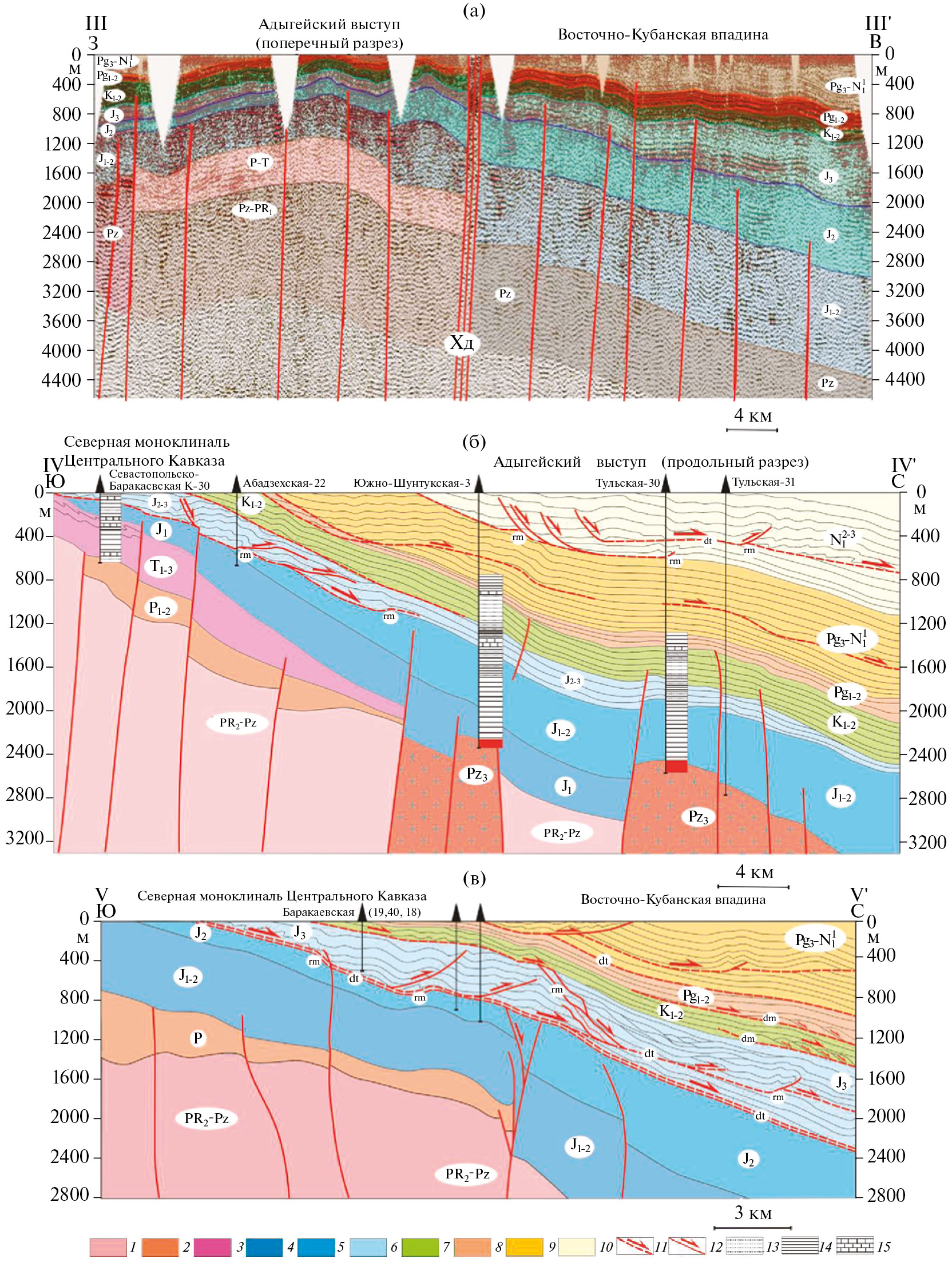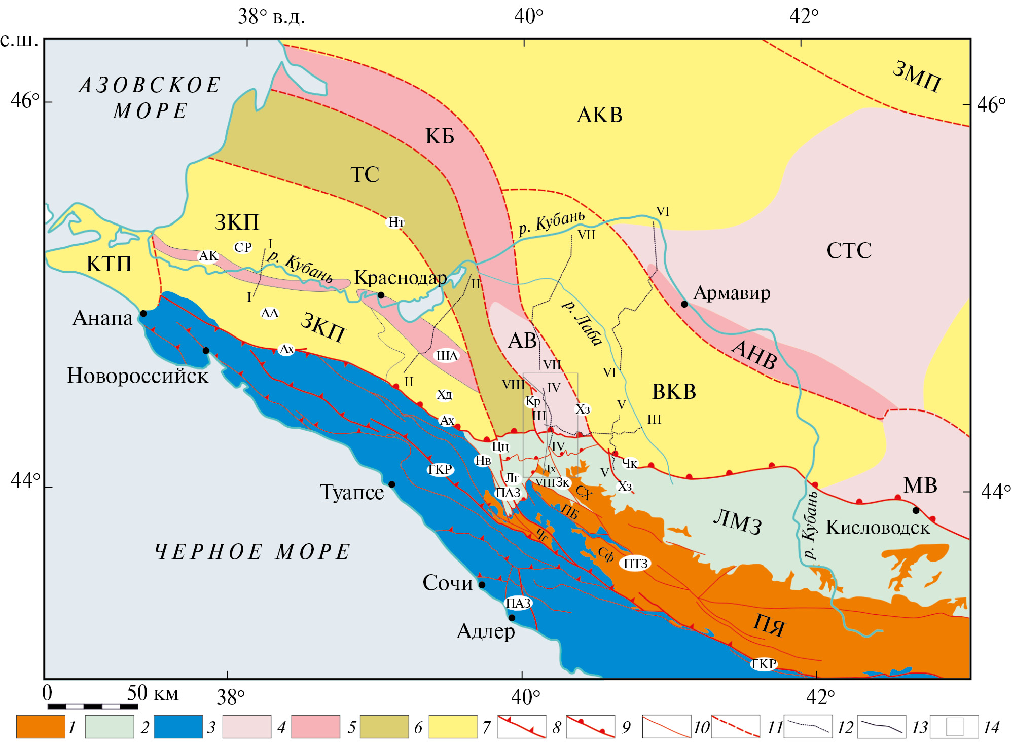 4‒7 – структуры Западно-Предкавказского прогиба: 4 – выступы, 5 – системы валообразных поднятий, 6 – ступени, 7 – впадины; 8‒11 – разрывы: 8 – взбросы и надвиги, 9 ‒ детачменты, 10 – неустановленной кинематики, 11 – скрытые под осадками чехла; 12‒13 – линии разрезов: 12 ‒ сейсмических, 13 – геологических; 14 – участок проведения исследований в Адыгейском секторе