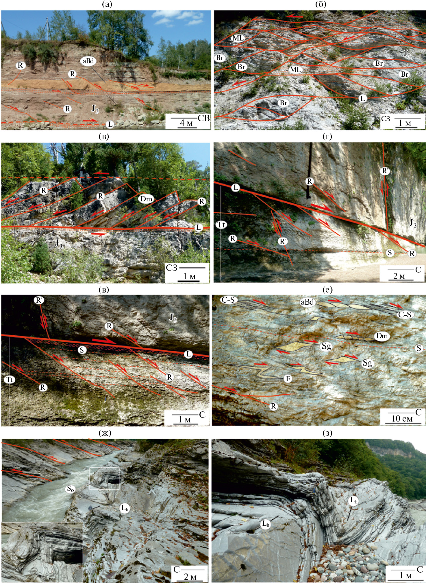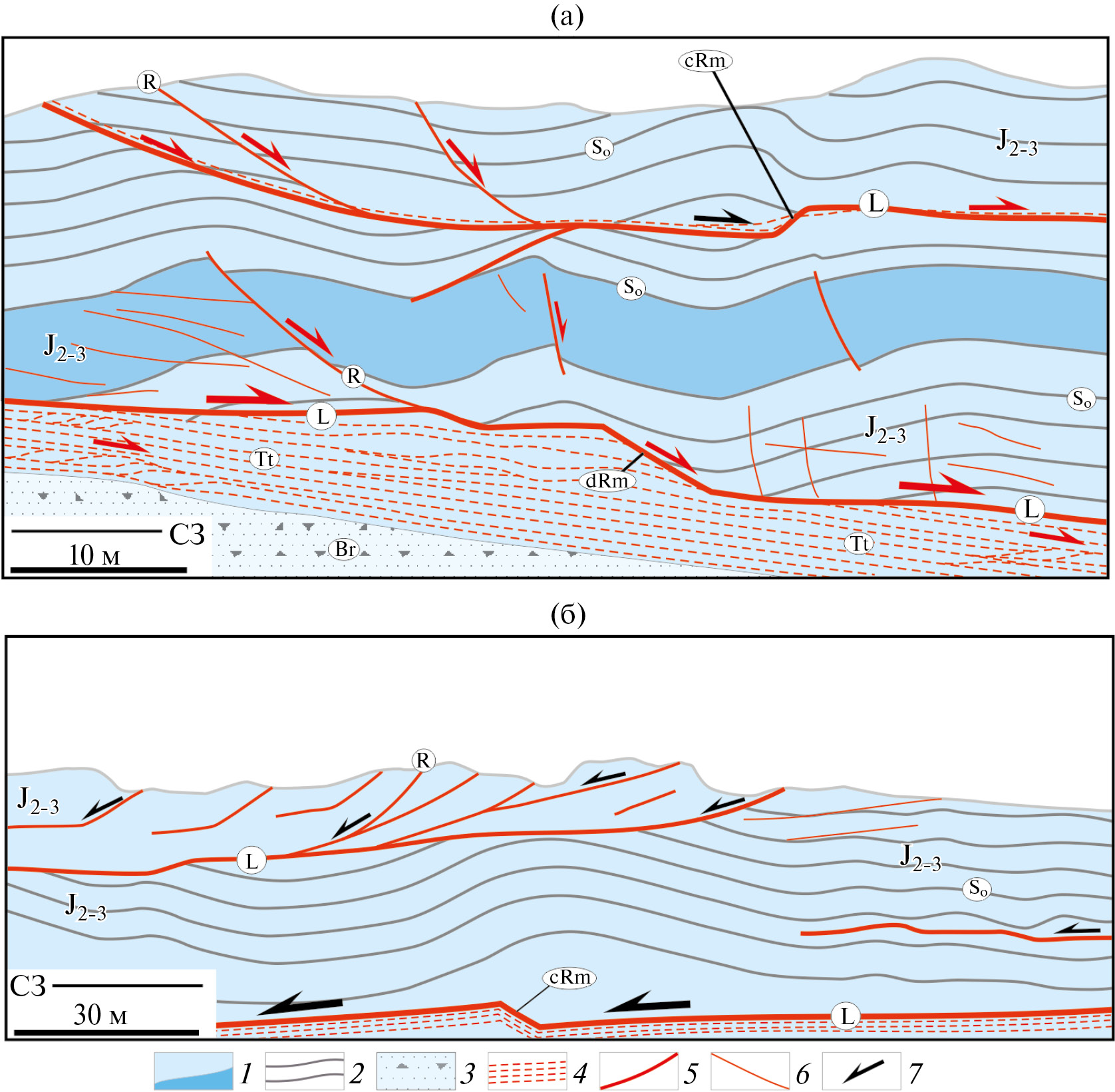 Эти породы относительно слабо дислоцированы, образуют открытые складки и пологие моноклинали, но вдоль тектонических нарушений интенсивность их деформаций существенно возрастает. При этом здесь проявлены сжатые складки, кливаж и разрывные нарушения взбросо- и сбросо-сдвиговой кинематики. В строении юрских толщ участвуют надвиги и покровы, а также связанные с ними мелкие асимметричные складки (см. рис. 3).