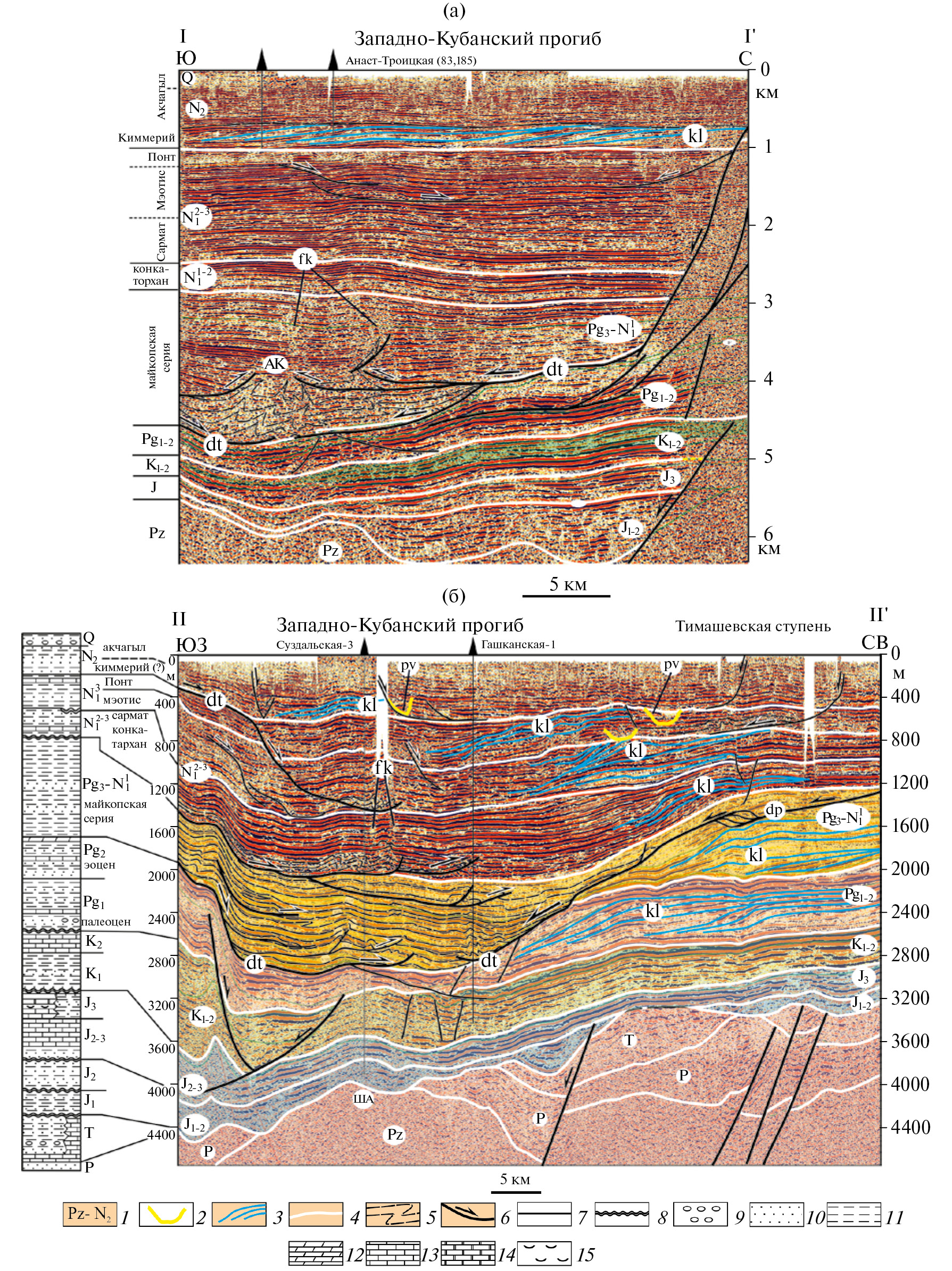В строении Западно-Предкавказского прогиба, по подошве альпийского комплекса (средняя юра, келловей) выделен ряд крупных структурных элементов [9] (см. рис. 1). В северной части рассматриваемой территории расположены две депрессии – зона Манычских прогибов и Азово-Кубанская депрессия, которая по направлению к югу становится более узкой и переходит в Восточно-Кубанскую впадину. С запада эти депрессии ограничены разрывами фундамента, которые контролируют Каневско-Березанскую систему валообразных поднятий и расположенный на их южном продолжении Адыгейский выступ. К юго-западу от этих поднятий расположена Тимашевская моноклинальная ступень, которая крупным Новотитаровским разломом отделена от Западно-Кубанского прогиба. Система впадин Западного Предкавказья с востока ограничена Ставропольским сводом и Минераловодским выступом.